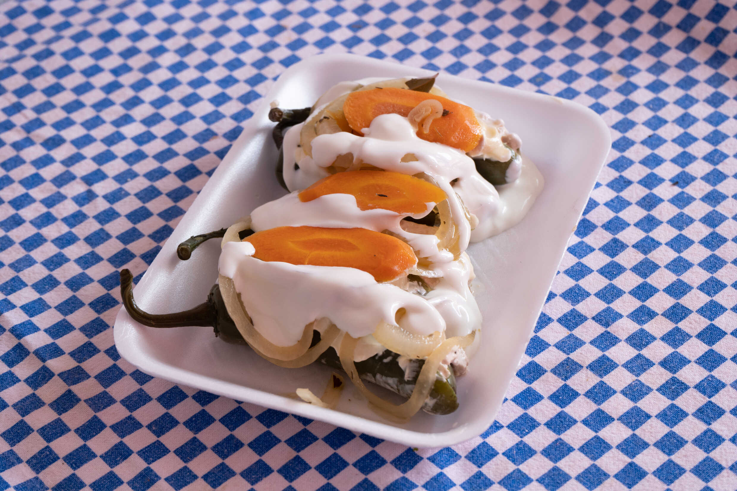 Contiene 3 piezas de Chile en frio de atún ,cebolla curtida,crema y zanahoria incluye saladitas