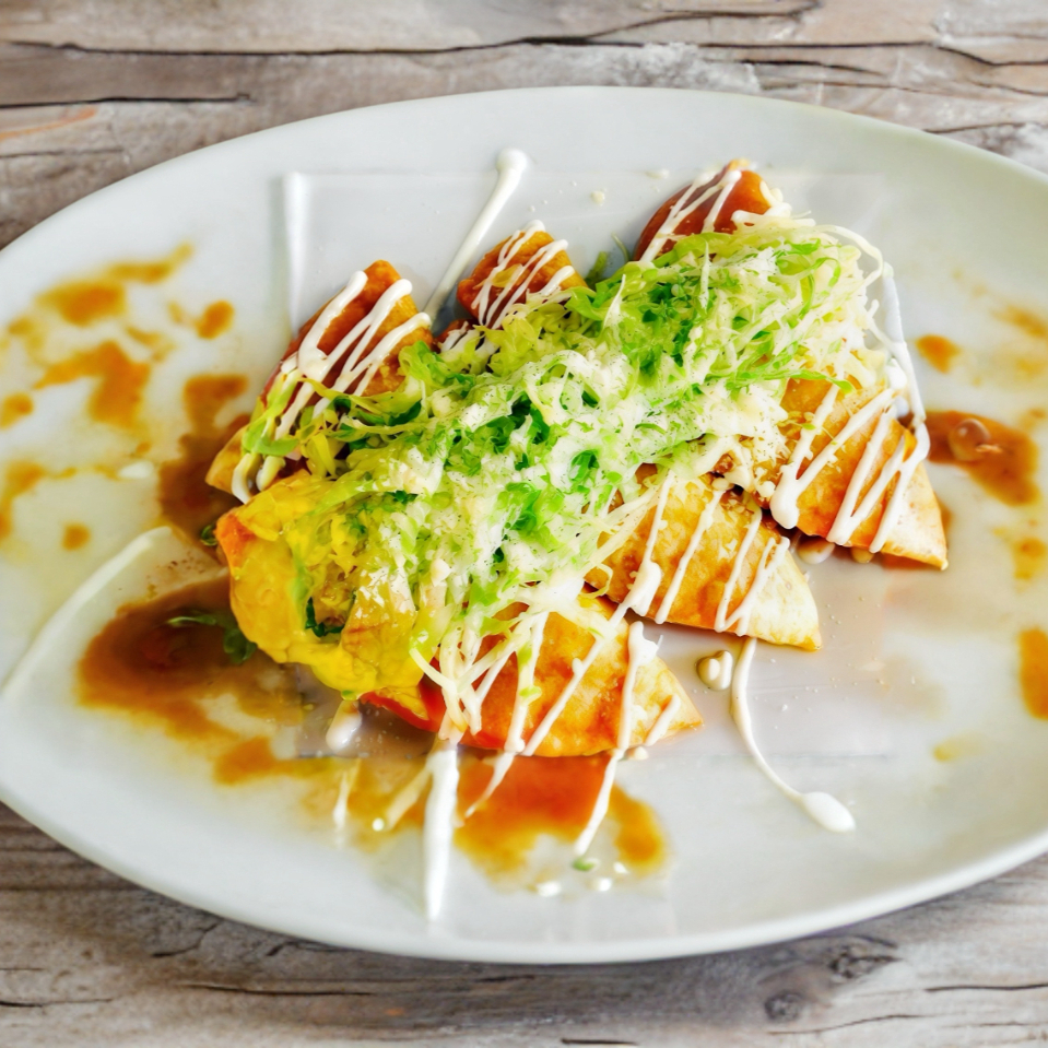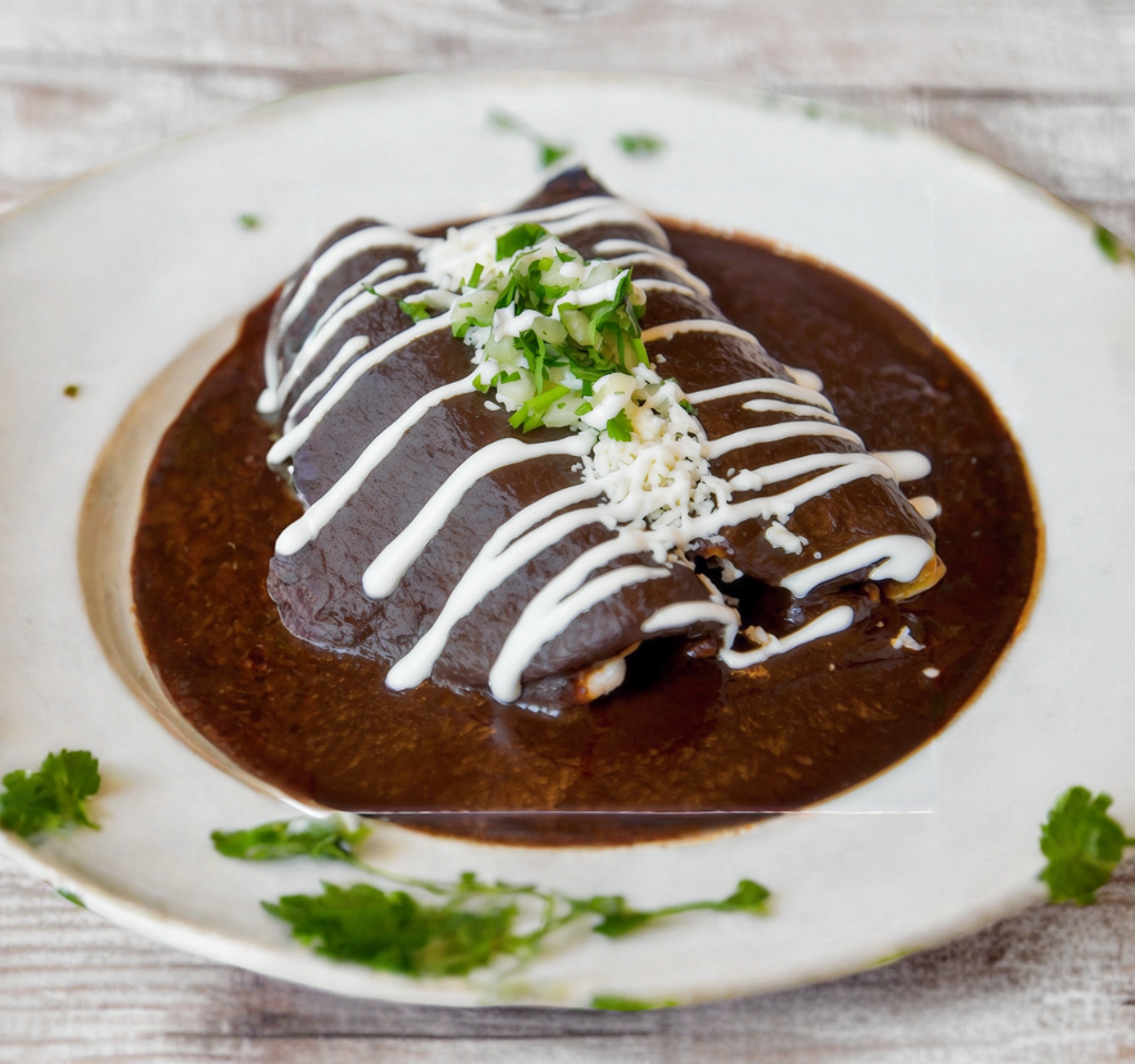 Enchilada de mole preparada con crema y queso( Tortilla a mano)
