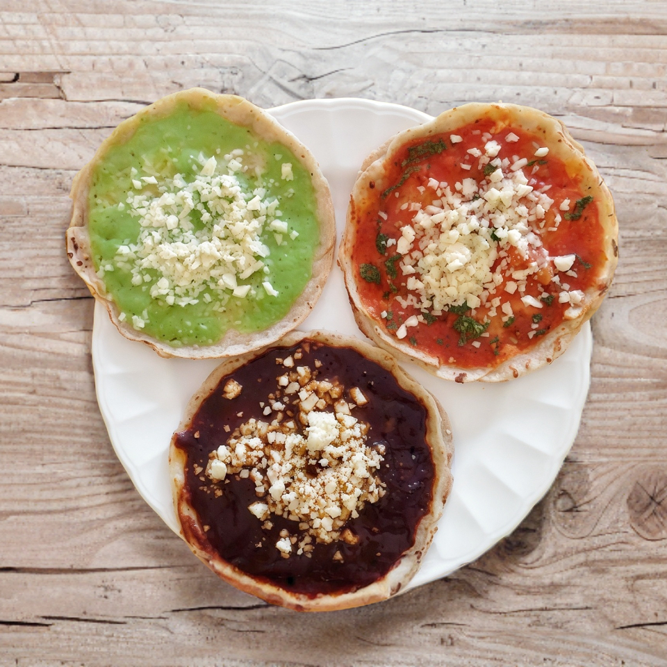 Pollo desmenuzado, jamón, queso manchego, queso oaxaca, aguacate, lechuga, cebolla y tomate.