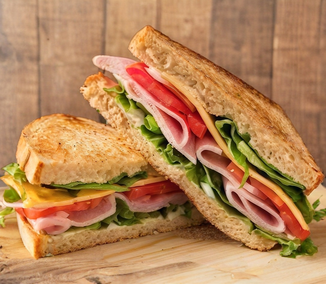 Sándwich de triple capa, jamón de pavo, pollo a la plancha, queso manchego, queso oaxaca, aguacate, tomate y lechuga