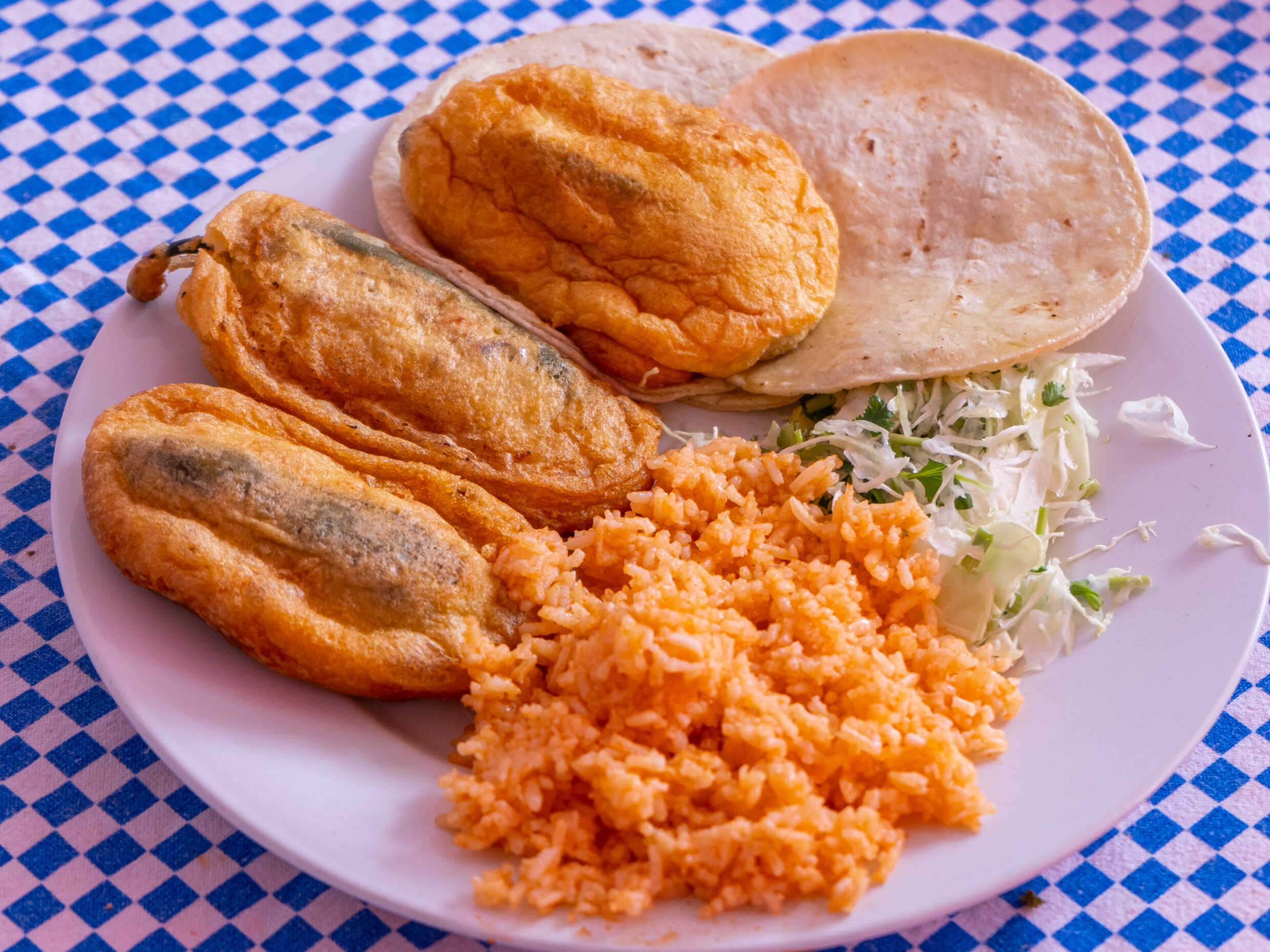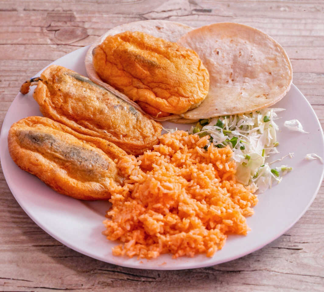 Incluye arroz, ensalada y tortillas. Dependiendo la cantidad de chiles que pida se le proporciona la cantidad de arroz y tortillas