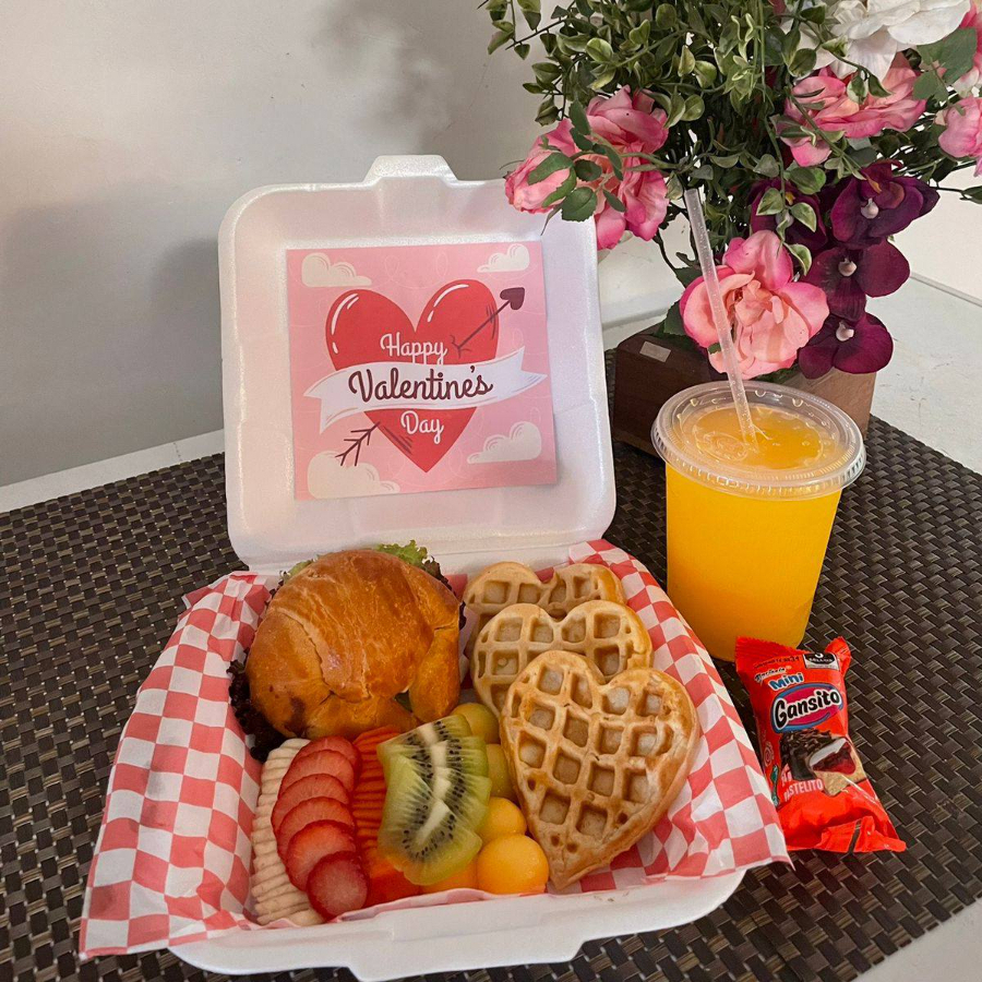 Sorprende a tu persona especial con este desayuno sorpresa, contiene un cuernito, waffles de corazón, fruta picada (papaya, plátano. melón, fresa y kiwi), un dulce a escoger y un catalogo extenso de bebidas a escoger, además podemos agregar una nota personalizada (favor de poner en comentarios tu mensaje)