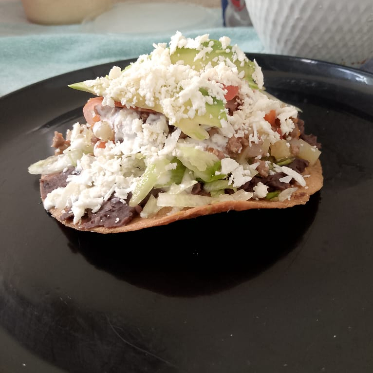 Ricas tostadas con frijol, lechuga, crema, salsa, tomate y guiso a escoger