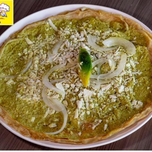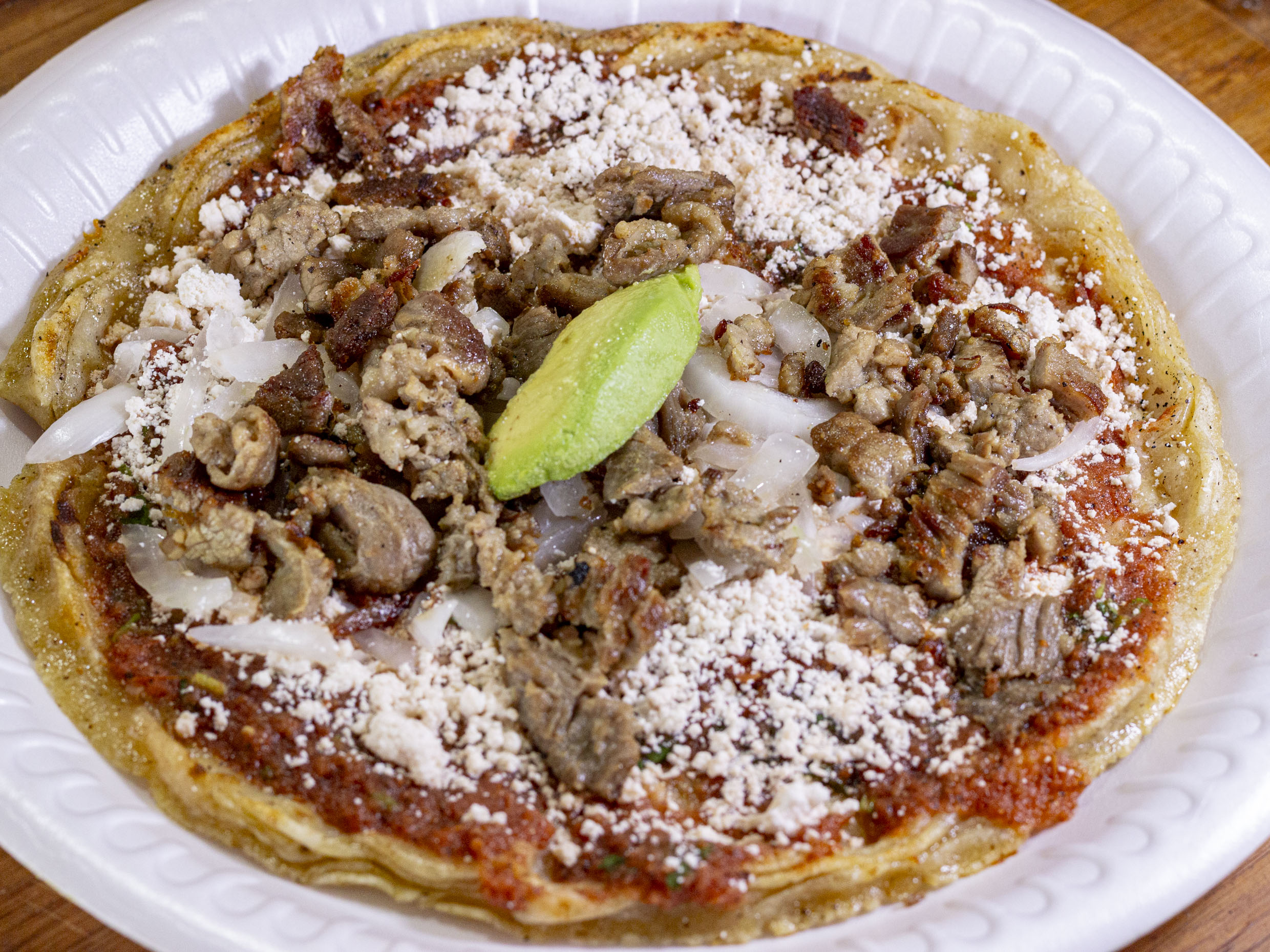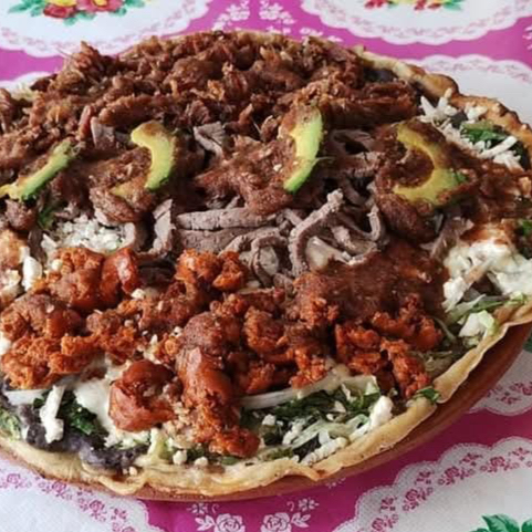 Una picada gigante, hecha con masa fresca y doradita al momento. Cubierta con una capa de frijoles refritos; lechuga, cebolla, ; mezcla de queso de hebra y queso. Combinación de bistec de res, chicharrón prensado y chorizo.Coronada con rebanadas de aguacate y la salsa de su preferencia