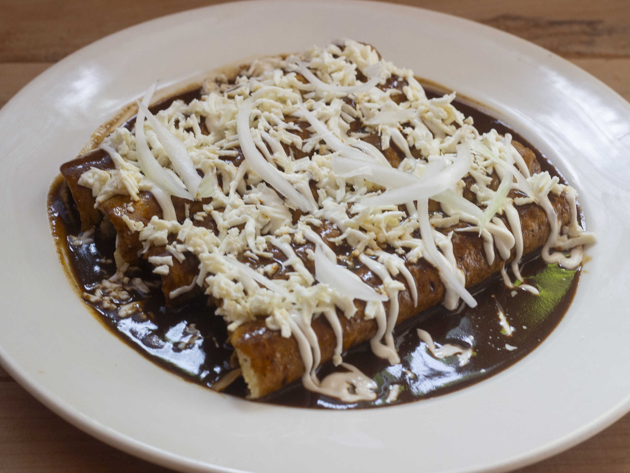 (5pzs) Tortilla hecha a mano rellena de pollo cubierta de mole queso y crema.