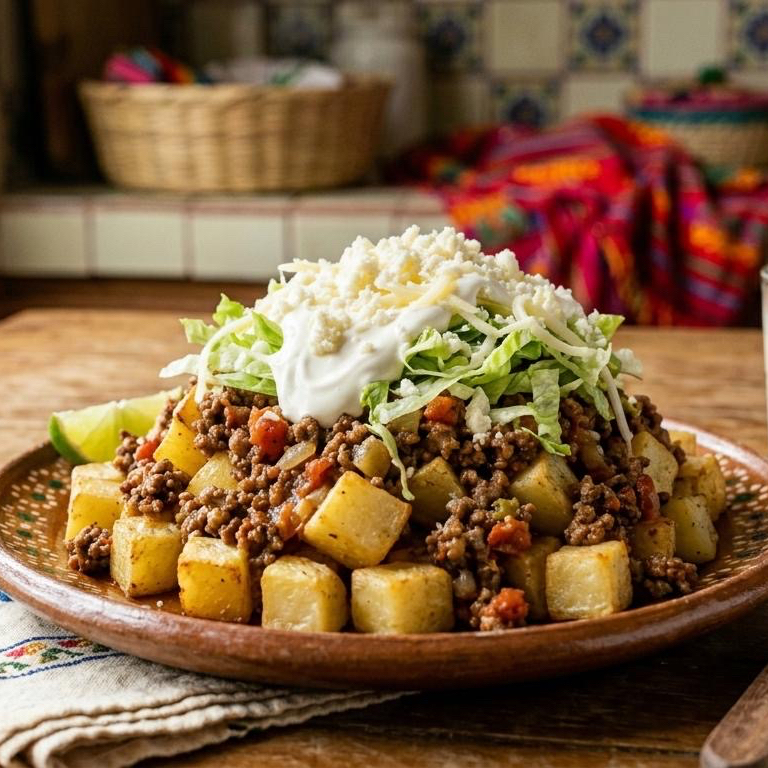 papa frita preparada con lechuga, queso, crema, aguacate, salsa y 1 ingrediente (picadillo o Pollo)