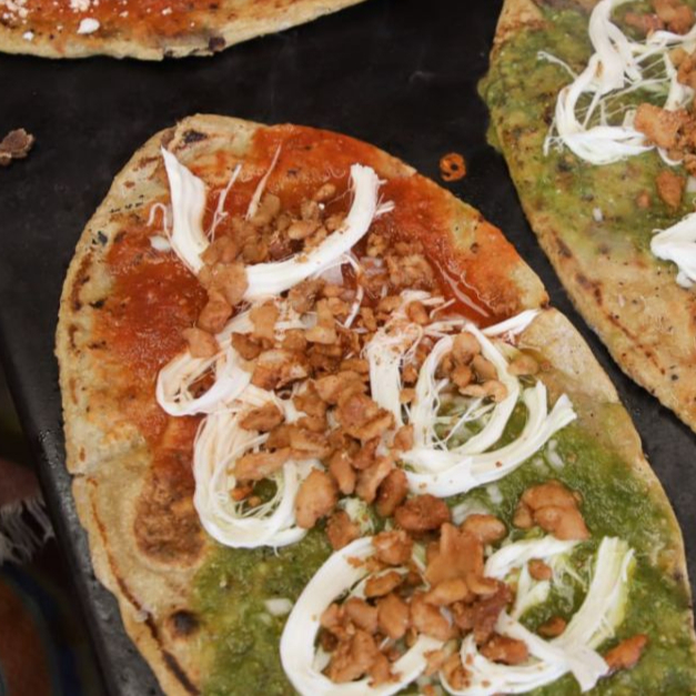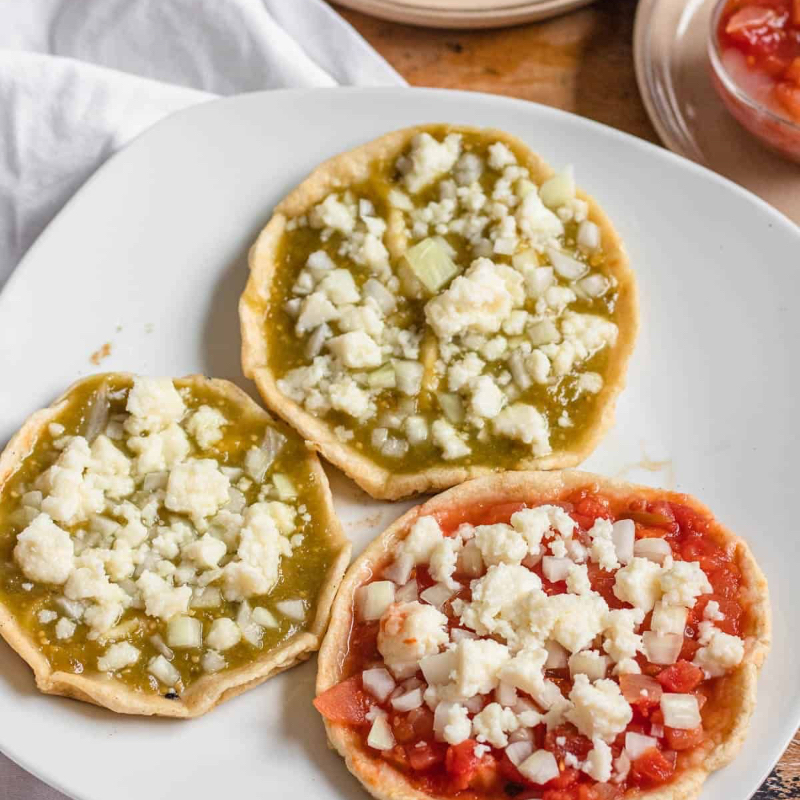 Tortilla gruesa de maíz ovalada cocinada al comal llevan frijoles refritos, salsa roja o verde, y queso fresco,