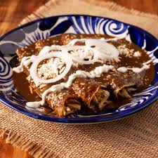 tortillas de maíz rellenas de pollo deshebrado, bañadas en salsa de mole poblano con queso crema y cebolla