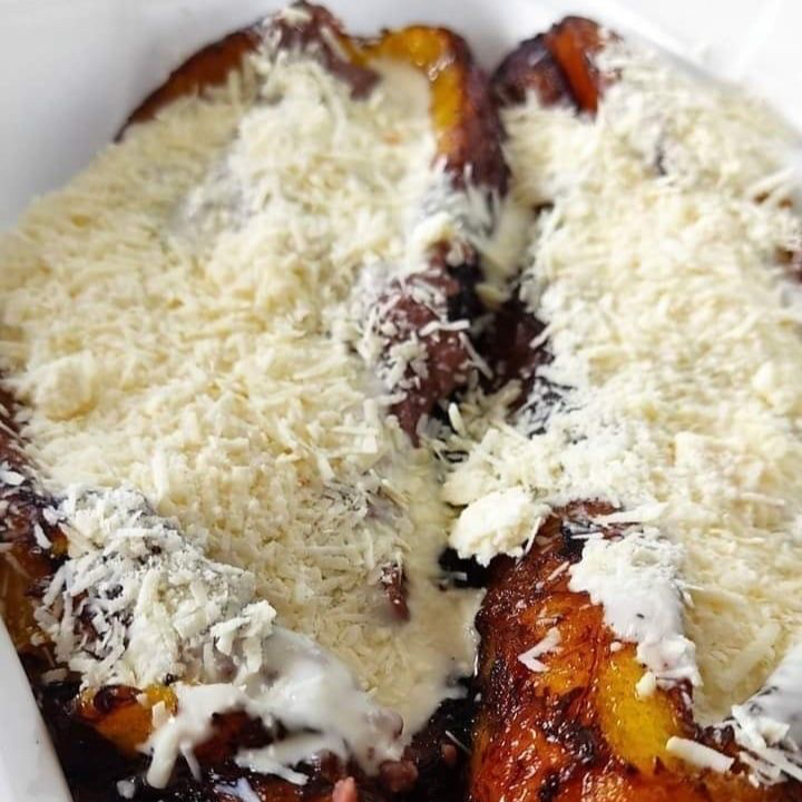 plátano macho frito cubiertos con crema ácida/media crema y queso fresco o Cotija