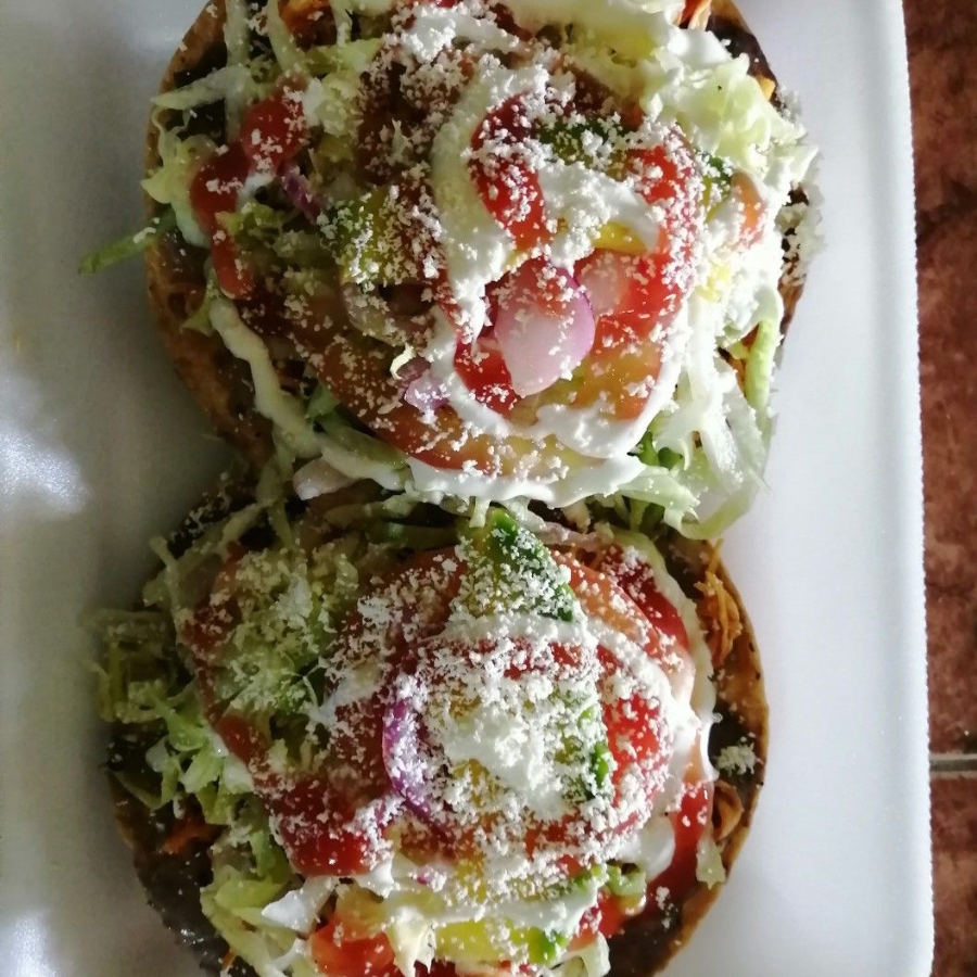 antojito frito de masa de maíz cubiertas con salsa, lechuga, queso fresco crema y aguacate