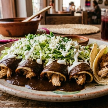 tortillas de maíz rellenas de pollo deshebrado, bañadas en salsa de mole poblano, lechuga, queso, crema y cebolla