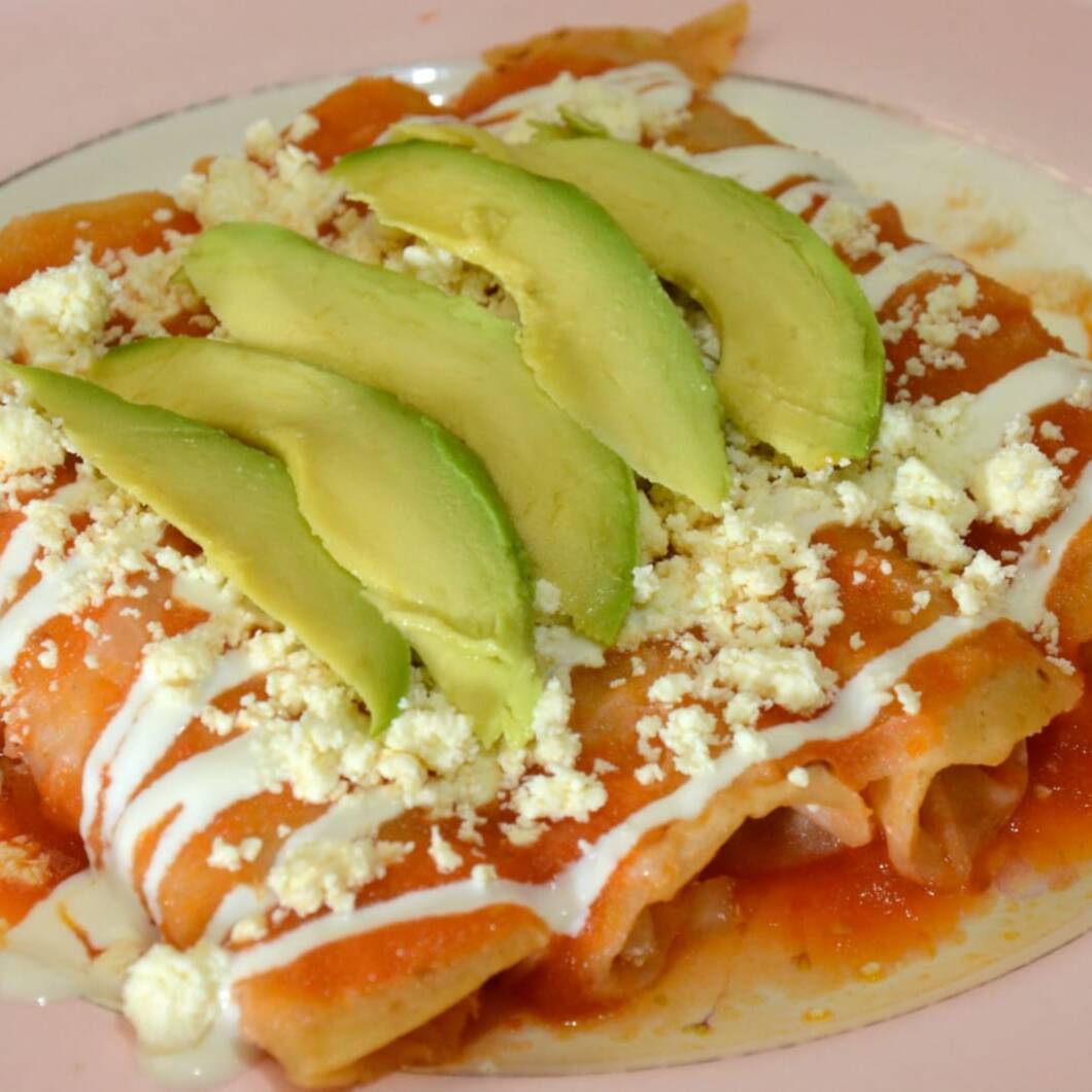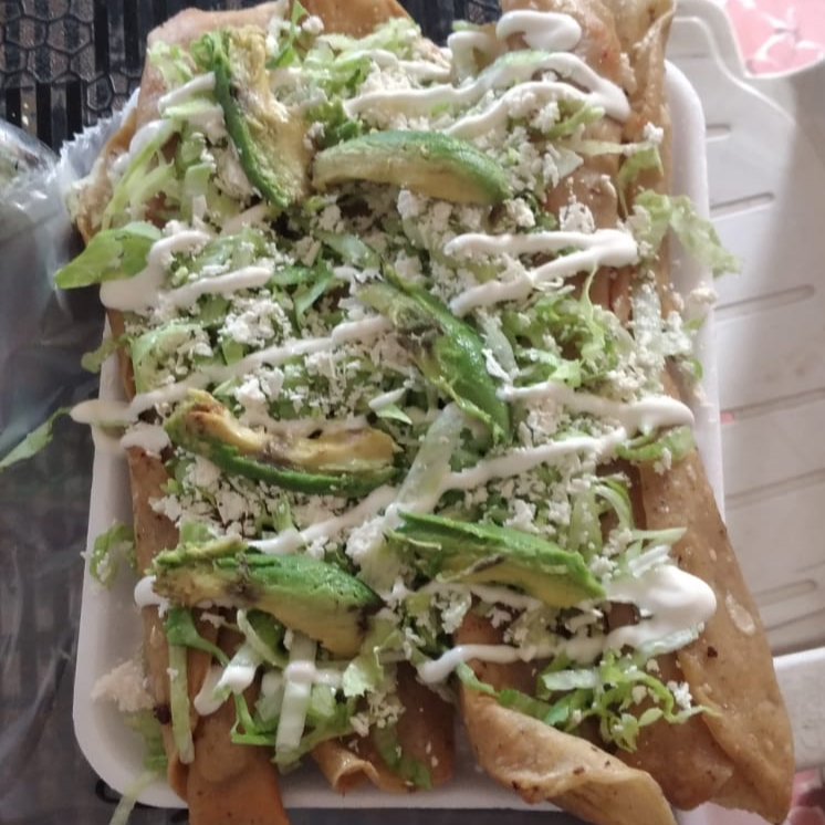 Tortilla de mano doradas rellenas de pollo, acompañadas con lechuga, crema, queso, aguacate y salsa