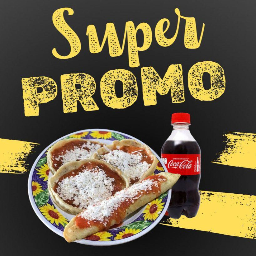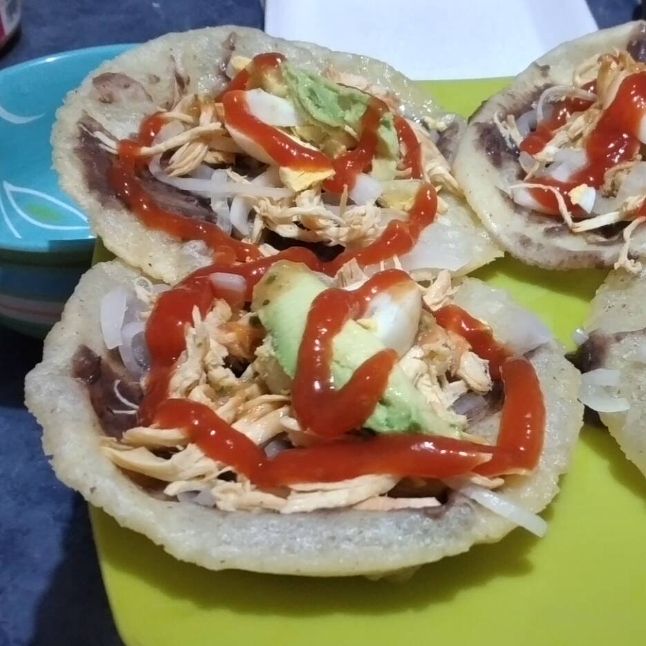 Tortilla de masa, lleva frijoles, pollo blanco, cebolla ala vinagreta, huevo, salsa catsup, aguacate y chile curtido
