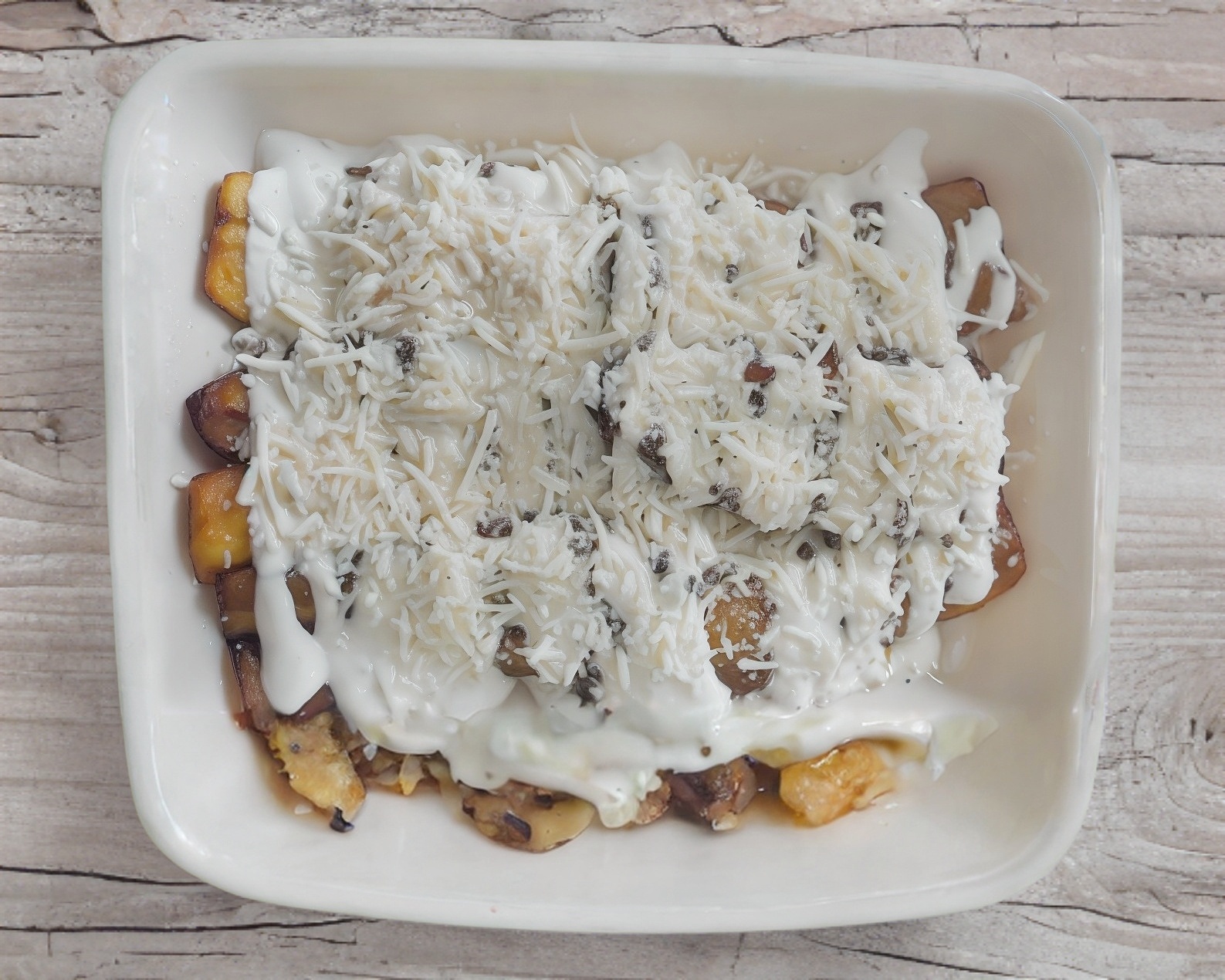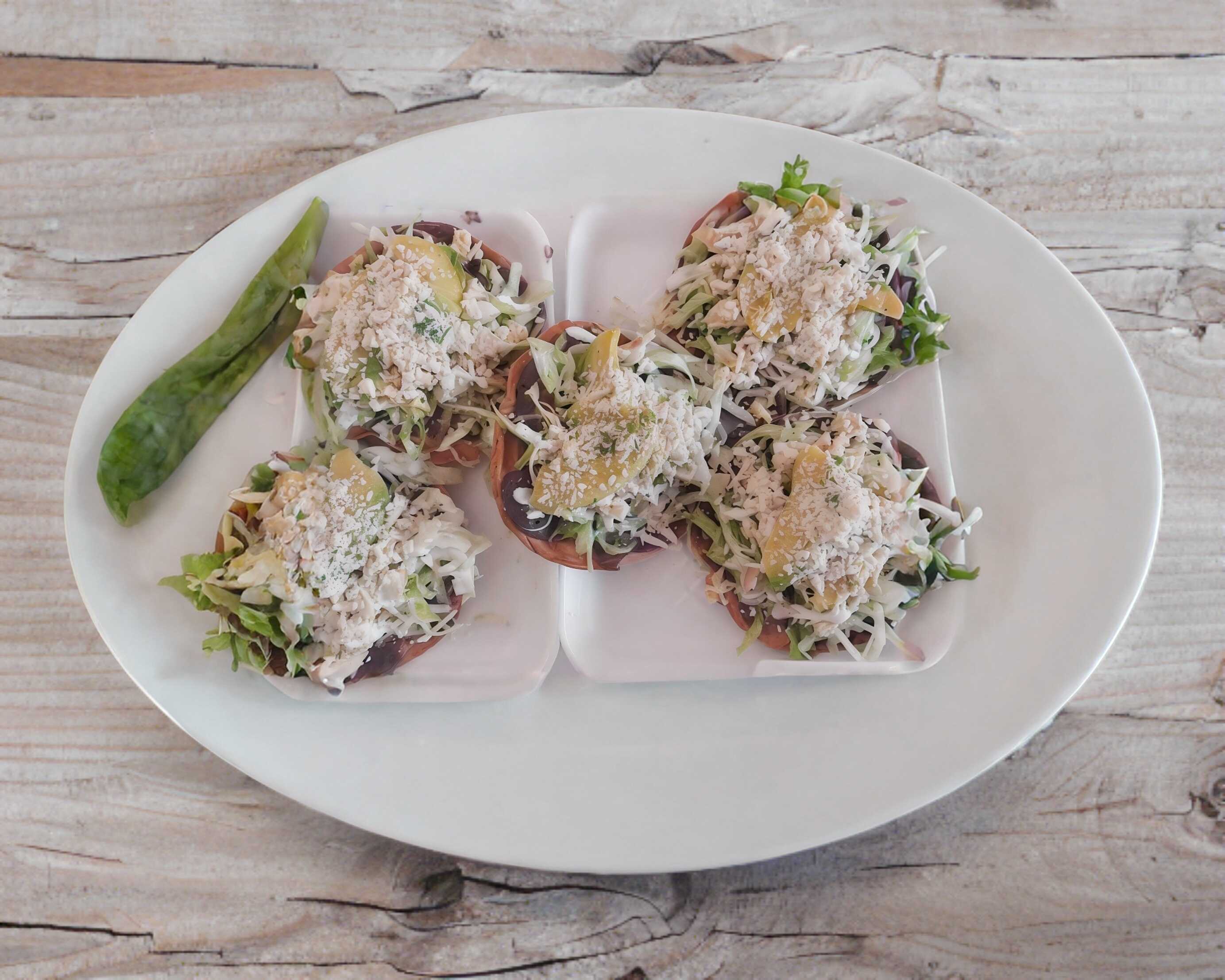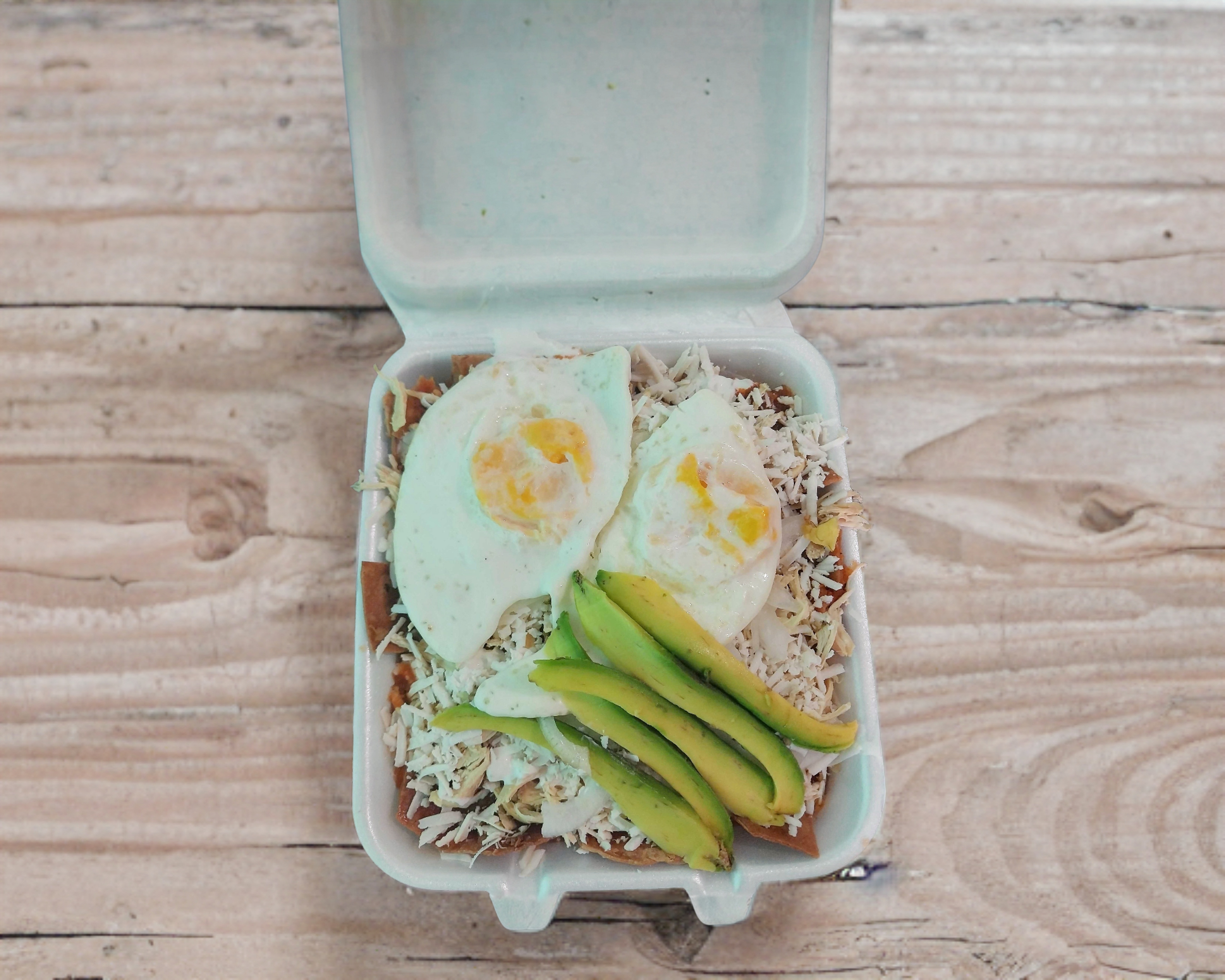 Totopos fritos bañados de salsa a elegir, pollo, cebolla, queso rayado, aguacate y 2 huevos estrellados arriba