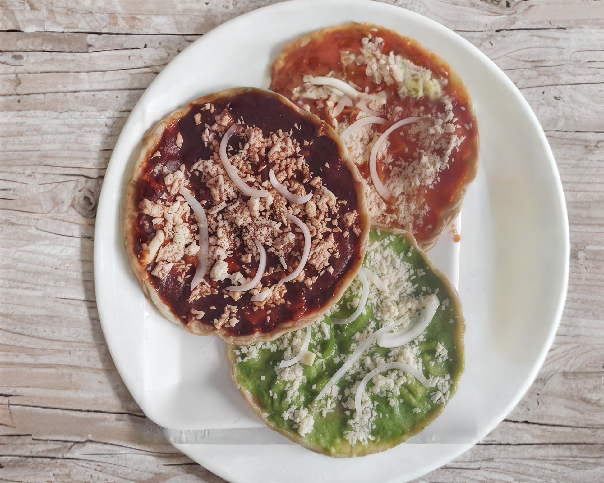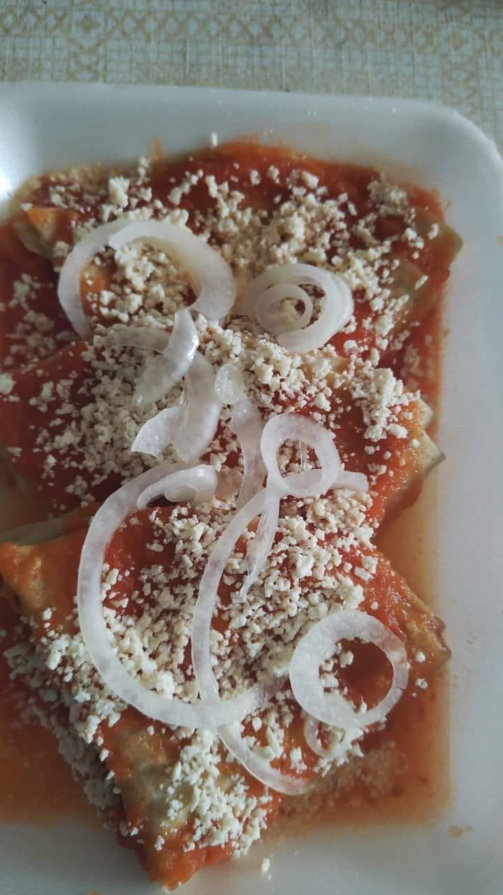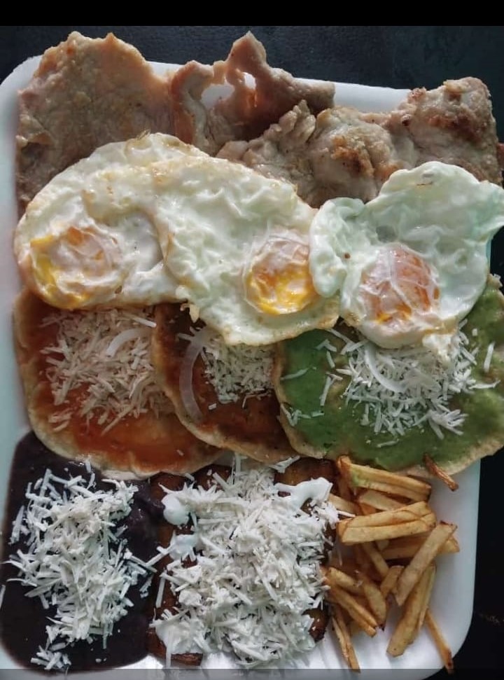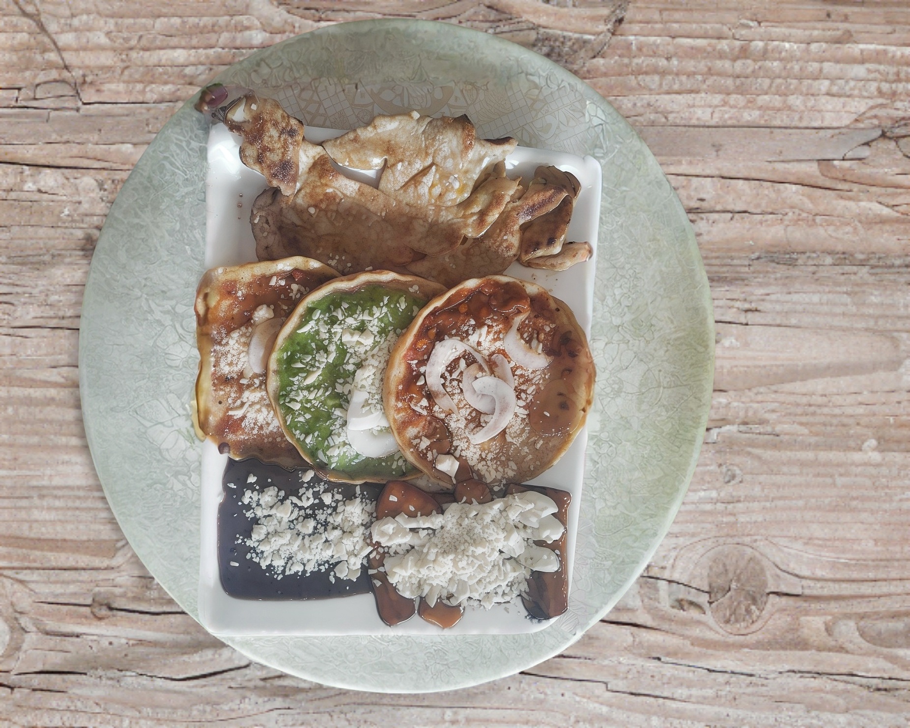 4 tortillas a mano bañadas en salsa a elegir, rellenas de ingrediente a elegir, acompañada de 2 huevos estrellados arriba con cebolla y queso