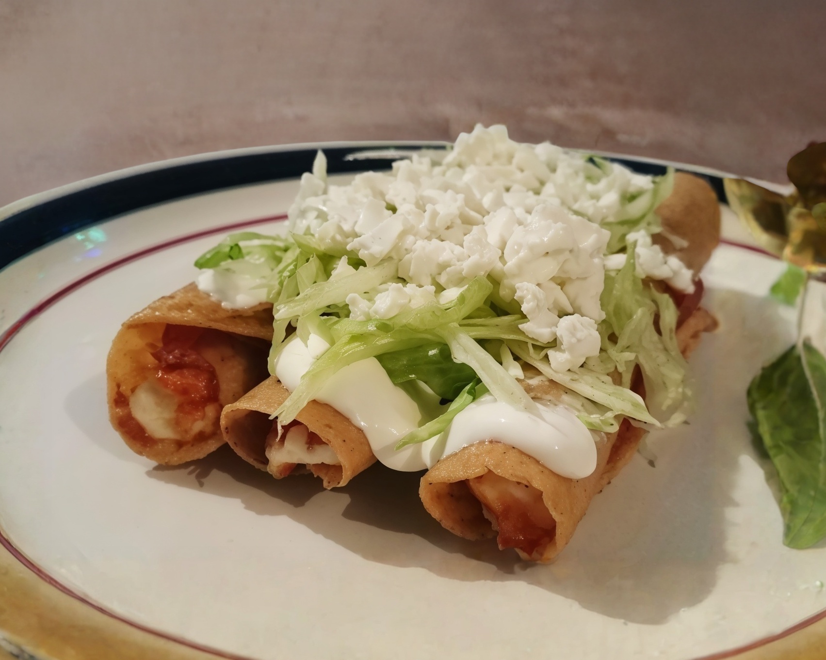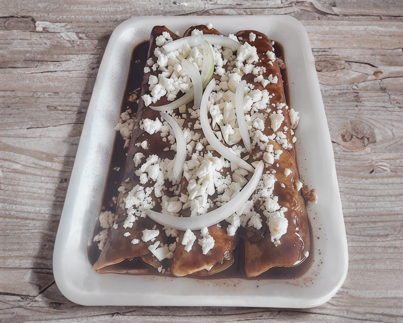 3 tortillas de maíz echas a mano bañadas con salsa a elegir, queso rayado y cebolla