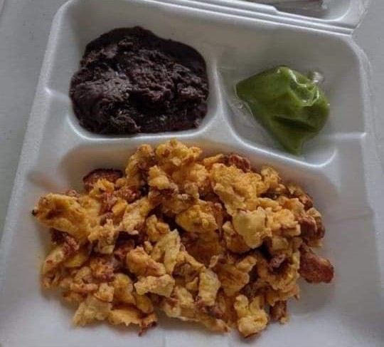Orden de huevos revueltos con longaniza acompañada de 4 tortillas a mano, y frijoles refritos