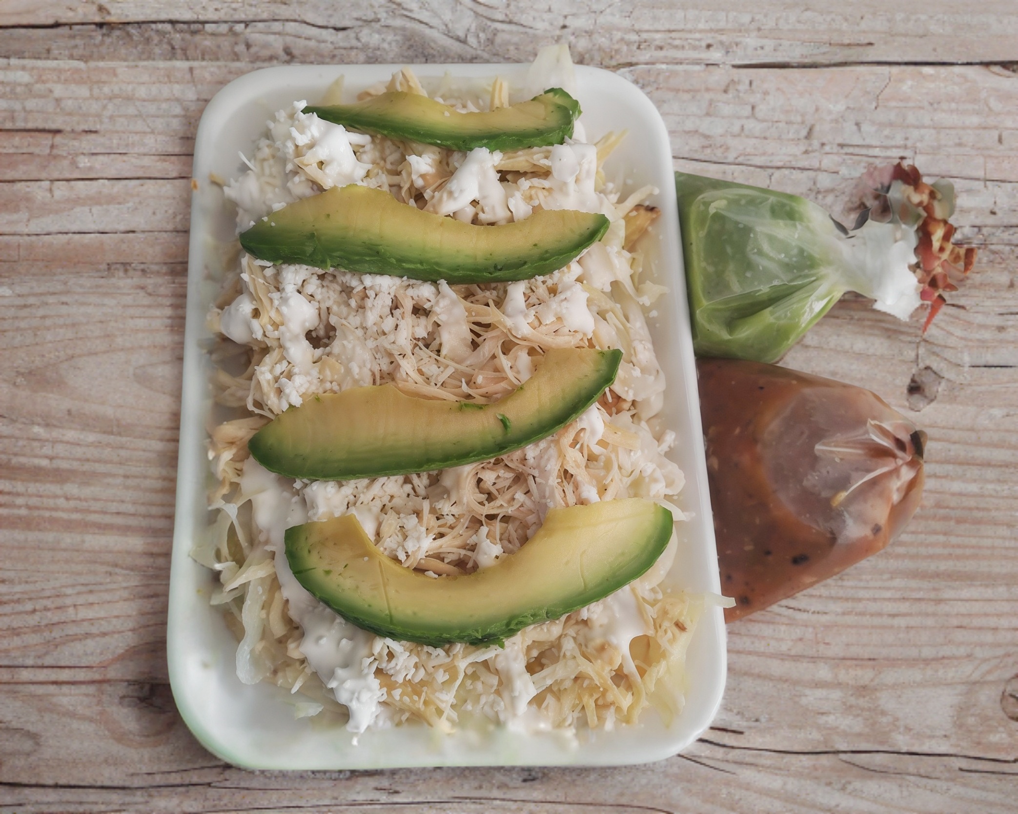 Tortilla de maíz con pollo, huevo duro, chile en raja, catsup y aguacate