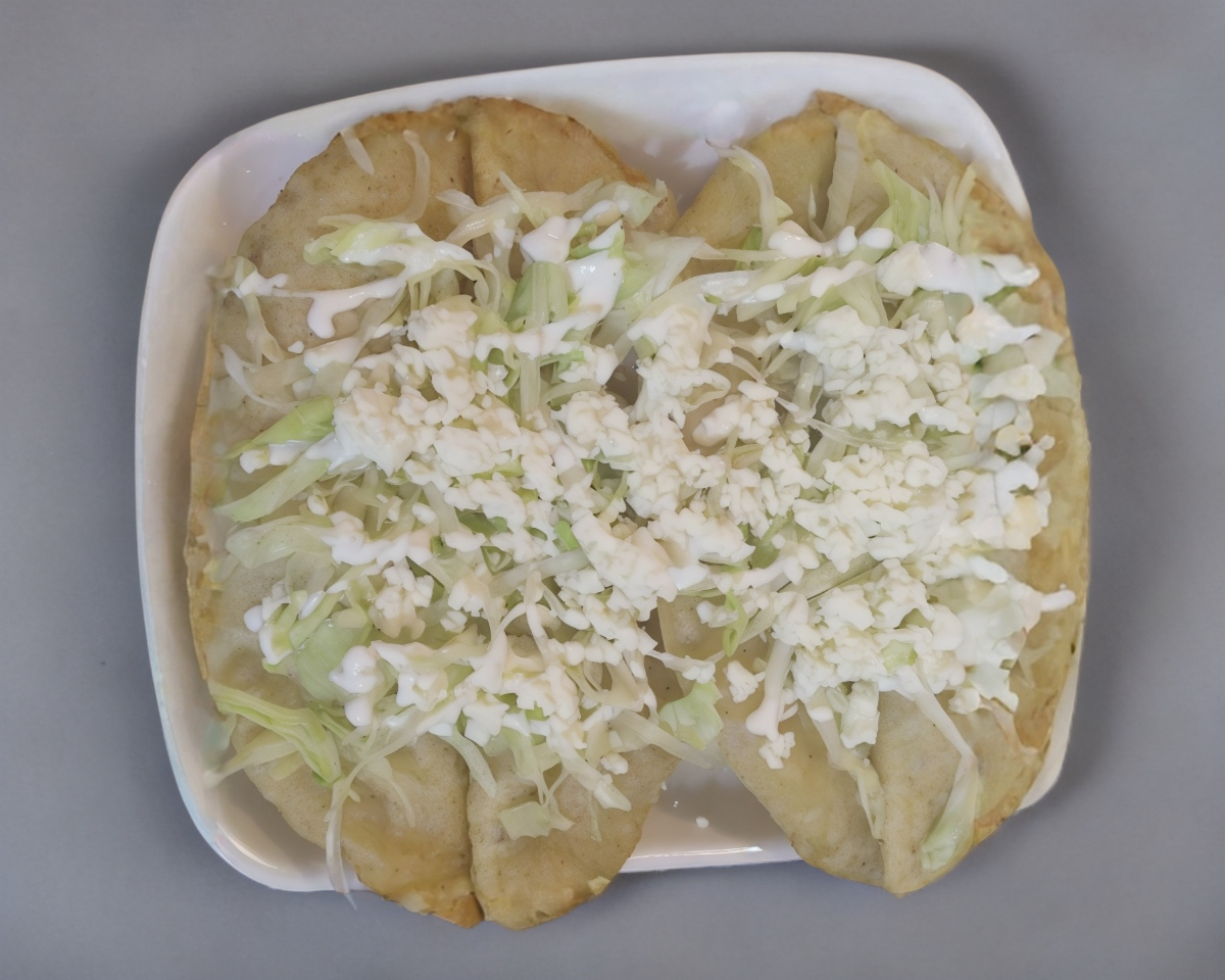 Papas cortadas en cubitos fritas y preparadas con (pollo, picadillo o chorizo) con lechuga, tomate aguacate, queso fresco y crema.