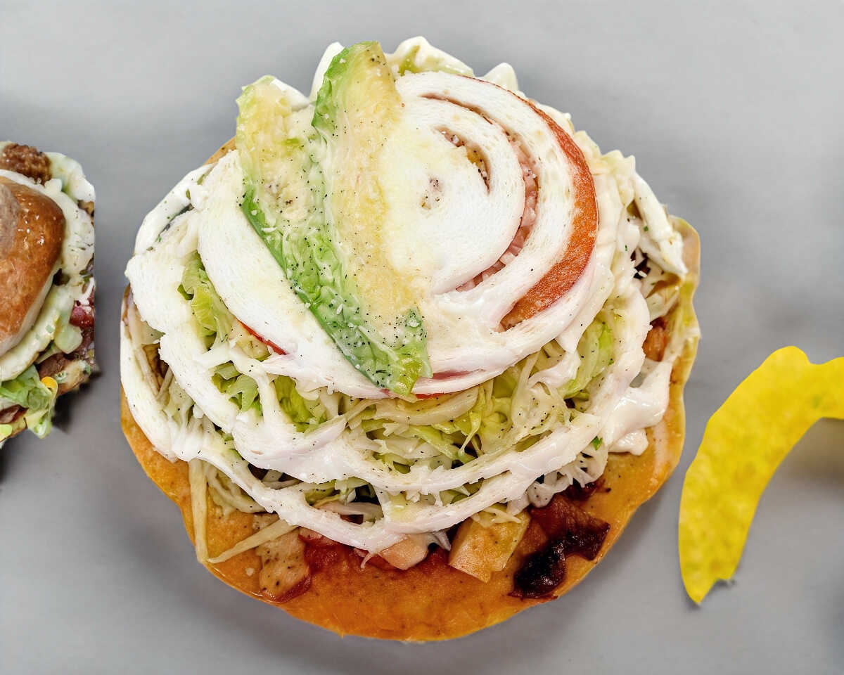 Tortilla hecha a mano bañada en salsa tomate, verde, ranchera, chipotle o mole preparadas con pollo, picadillo, chorizo o bistec queso de hebra, lechuga,tomate, aguacate, queso fresco y crema.