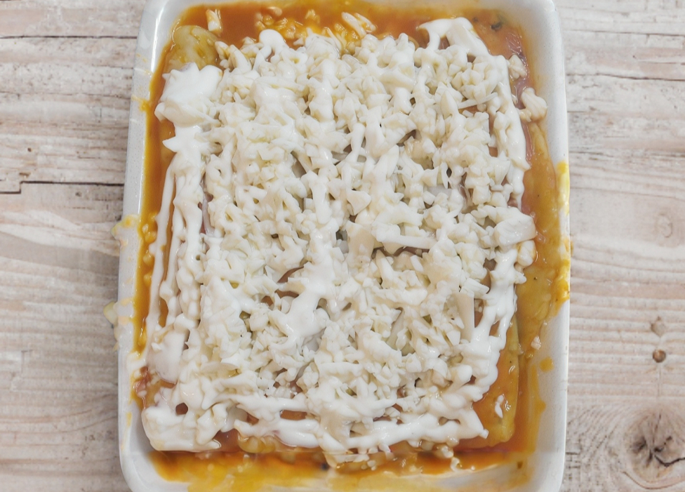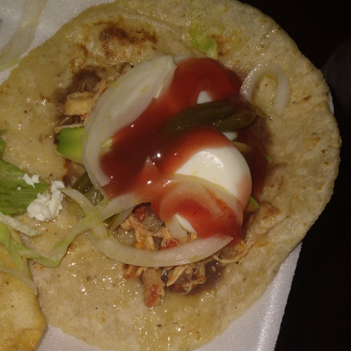 Tortilla de maíz con frijoles, pollo guisado, huevo, chiles, cátsup y cebolla.