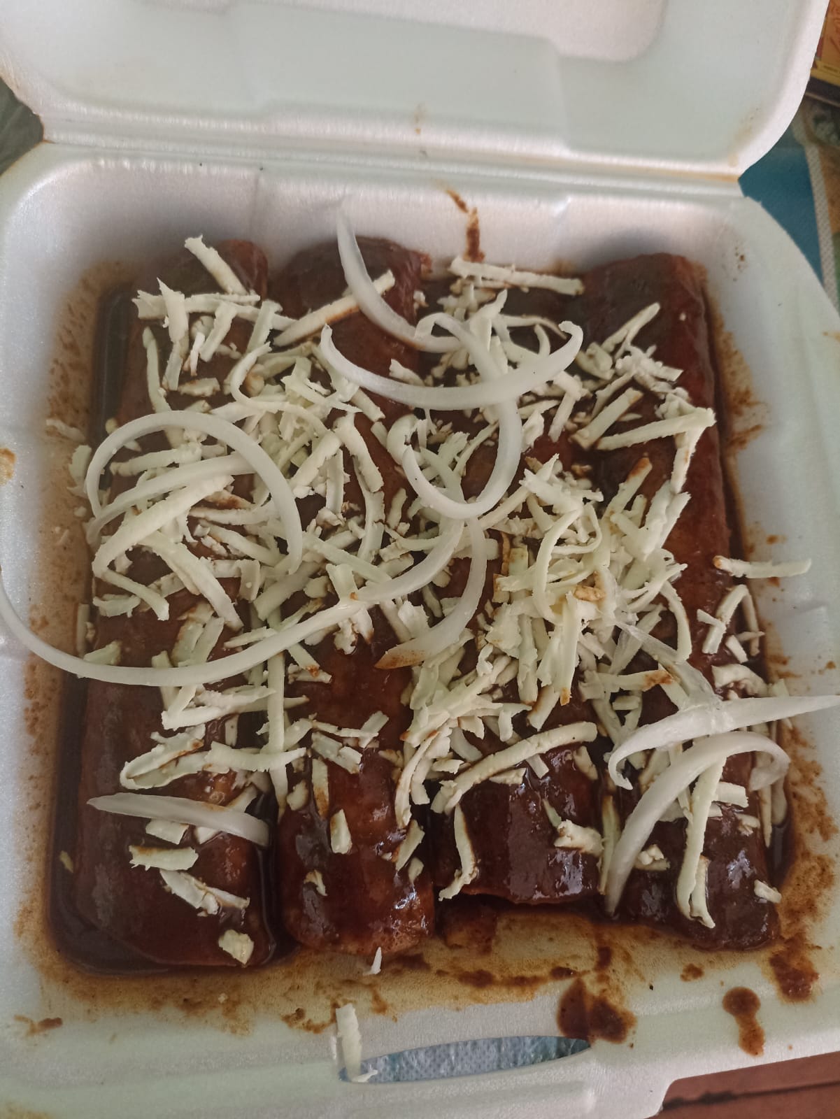 Tortilla de maíz rellena de pollo con mole y cebolla.