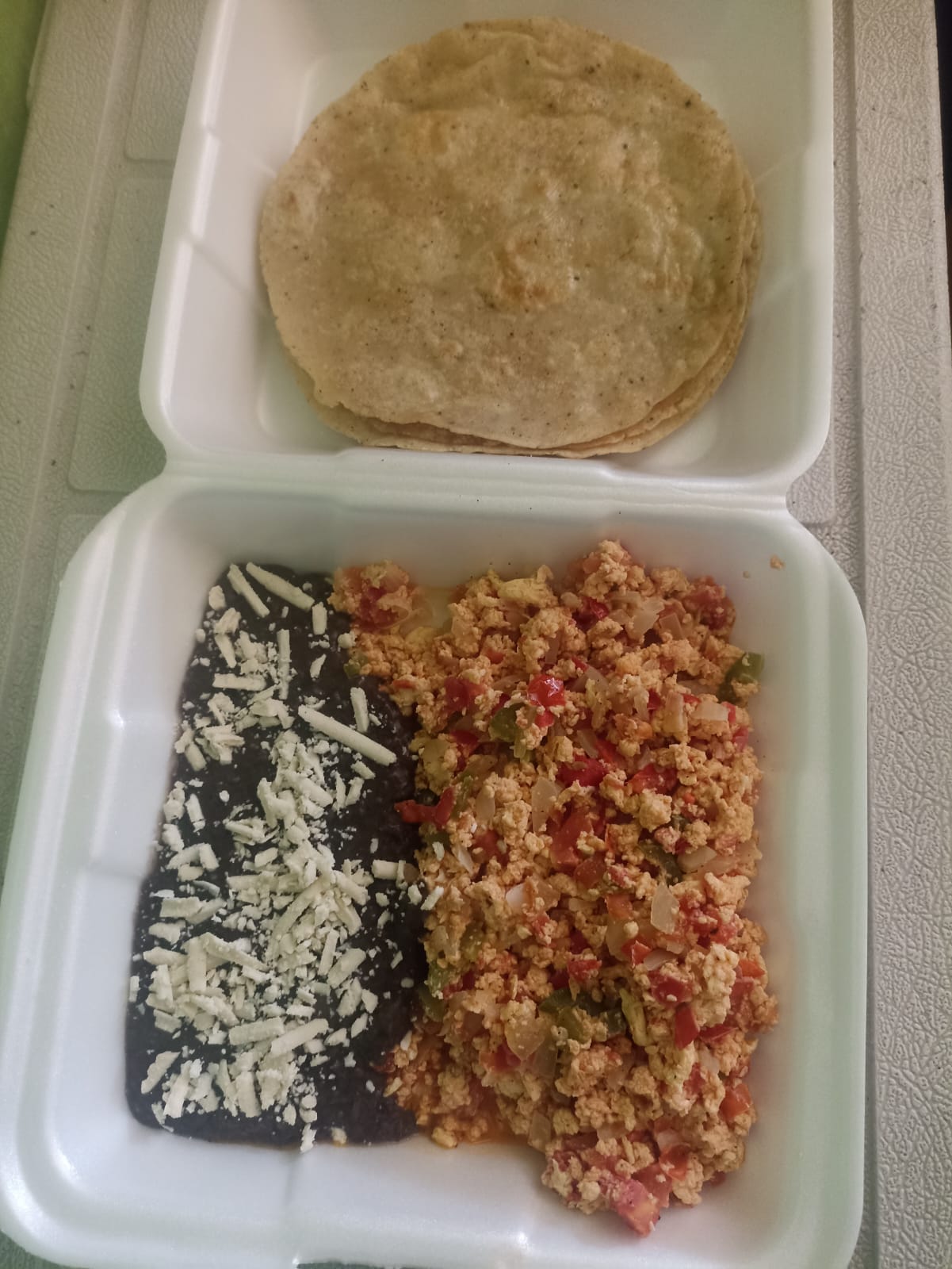 Huevos revueltos con jamón, frijoles y tortillas a mano