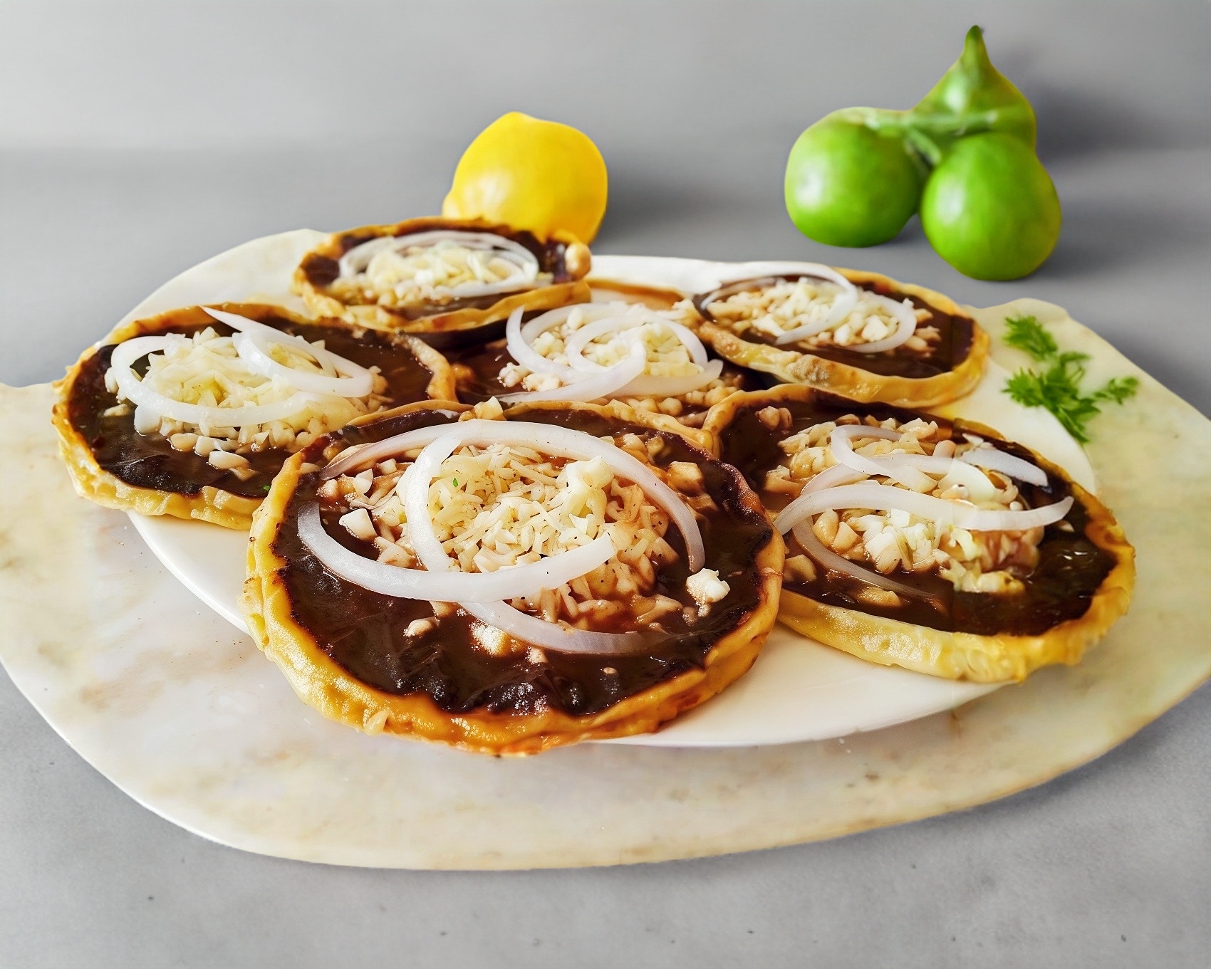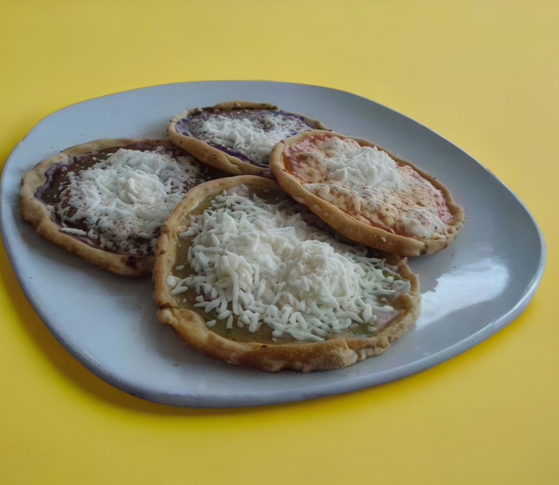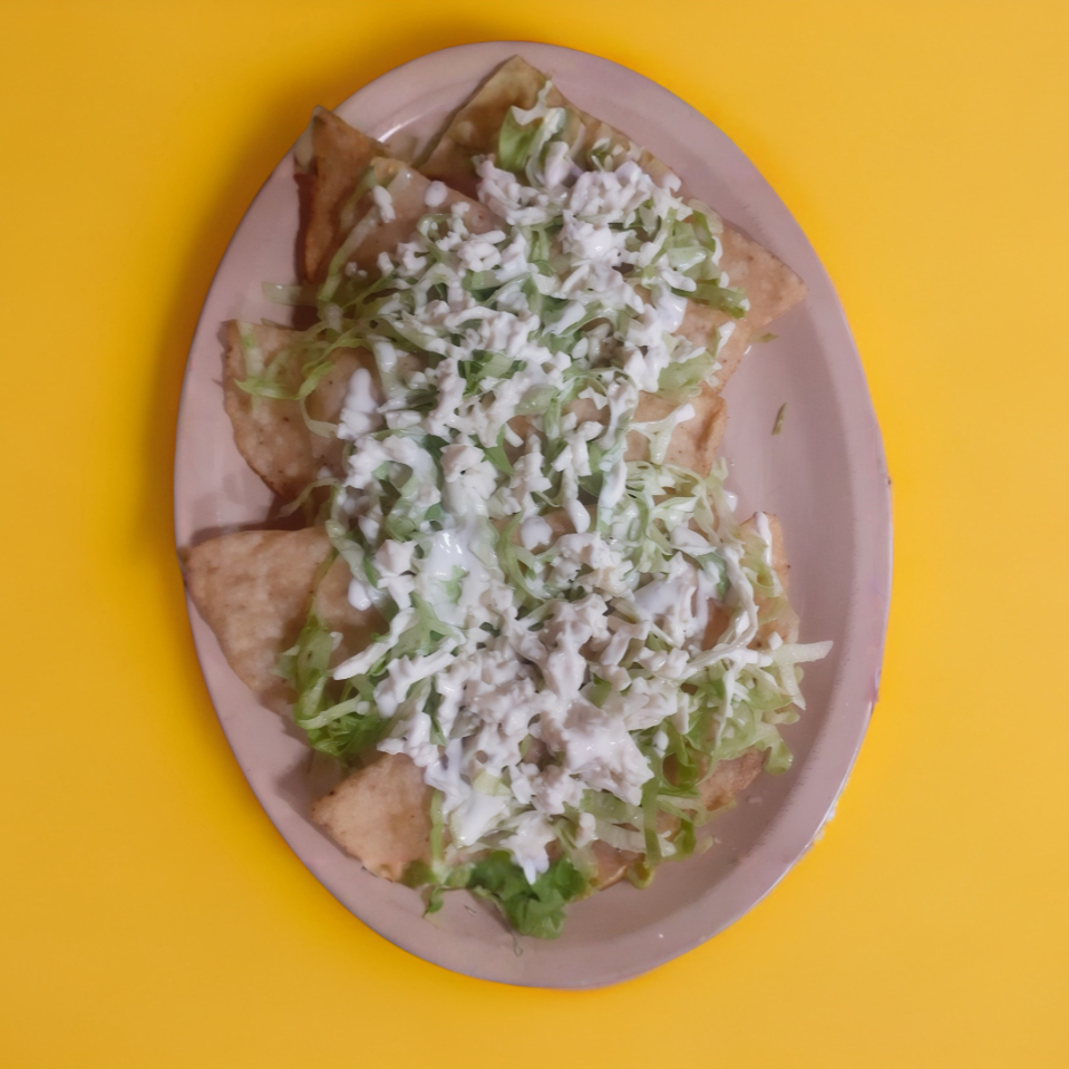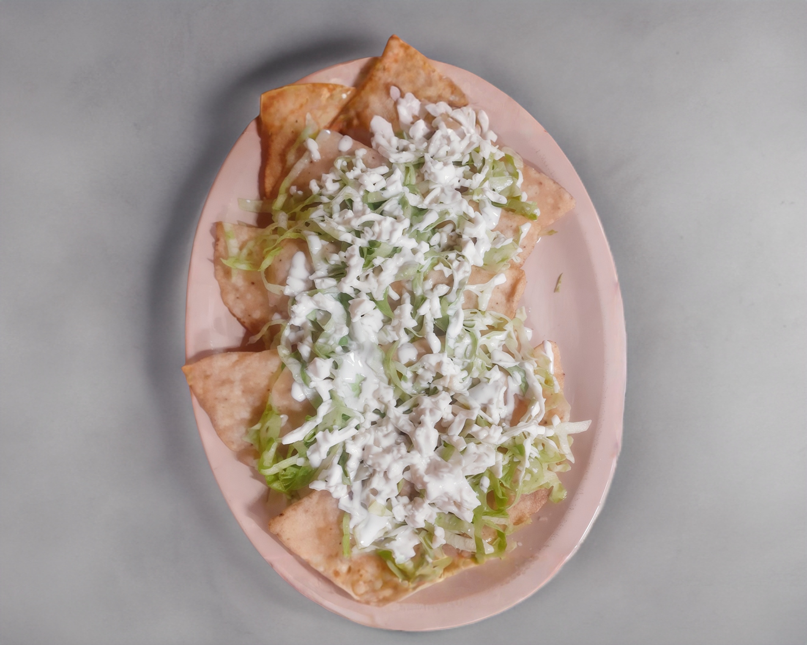 Tortilla de maíz frita pero inflada con salsa y queso.