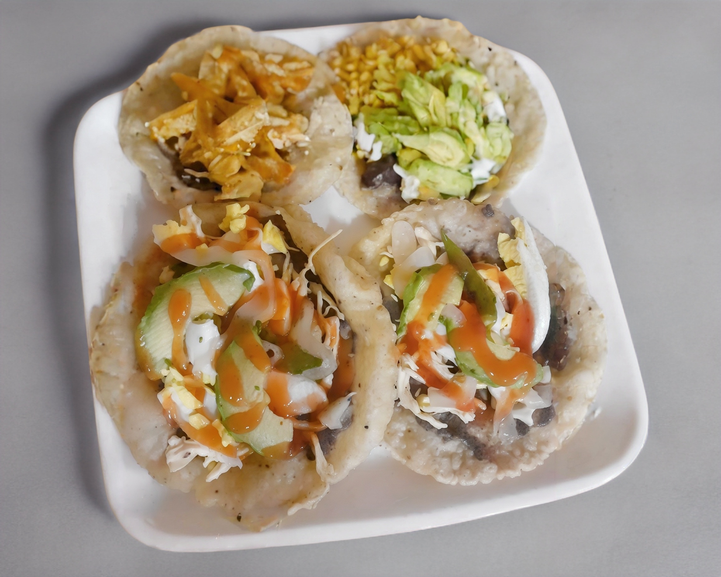 Tortilla de maíz crujiente con frijoles, pollo, lechuga, aguacate, tomate, crema y queso.