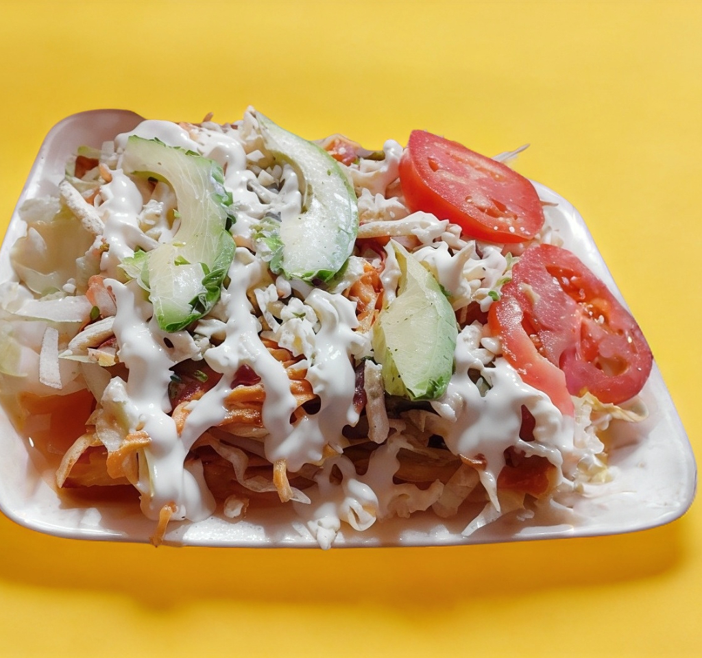 Papas fritas con pollo, lechuga, aguacate, tomate, salsa y queso.