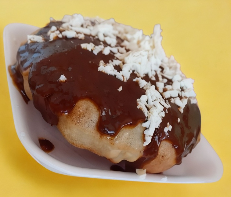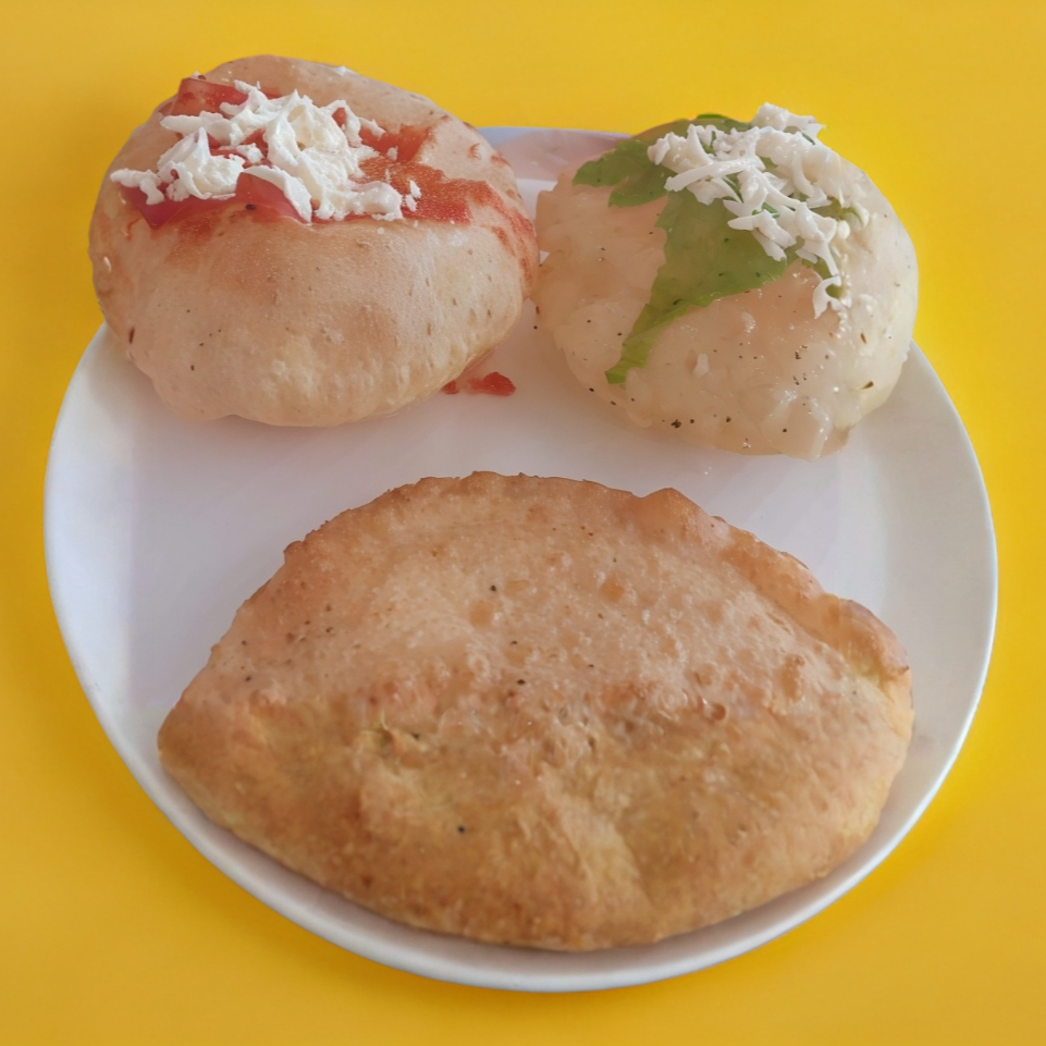 Tortilla de harina de maíz con panela, frita pero inflada con salsa y queso fresco
