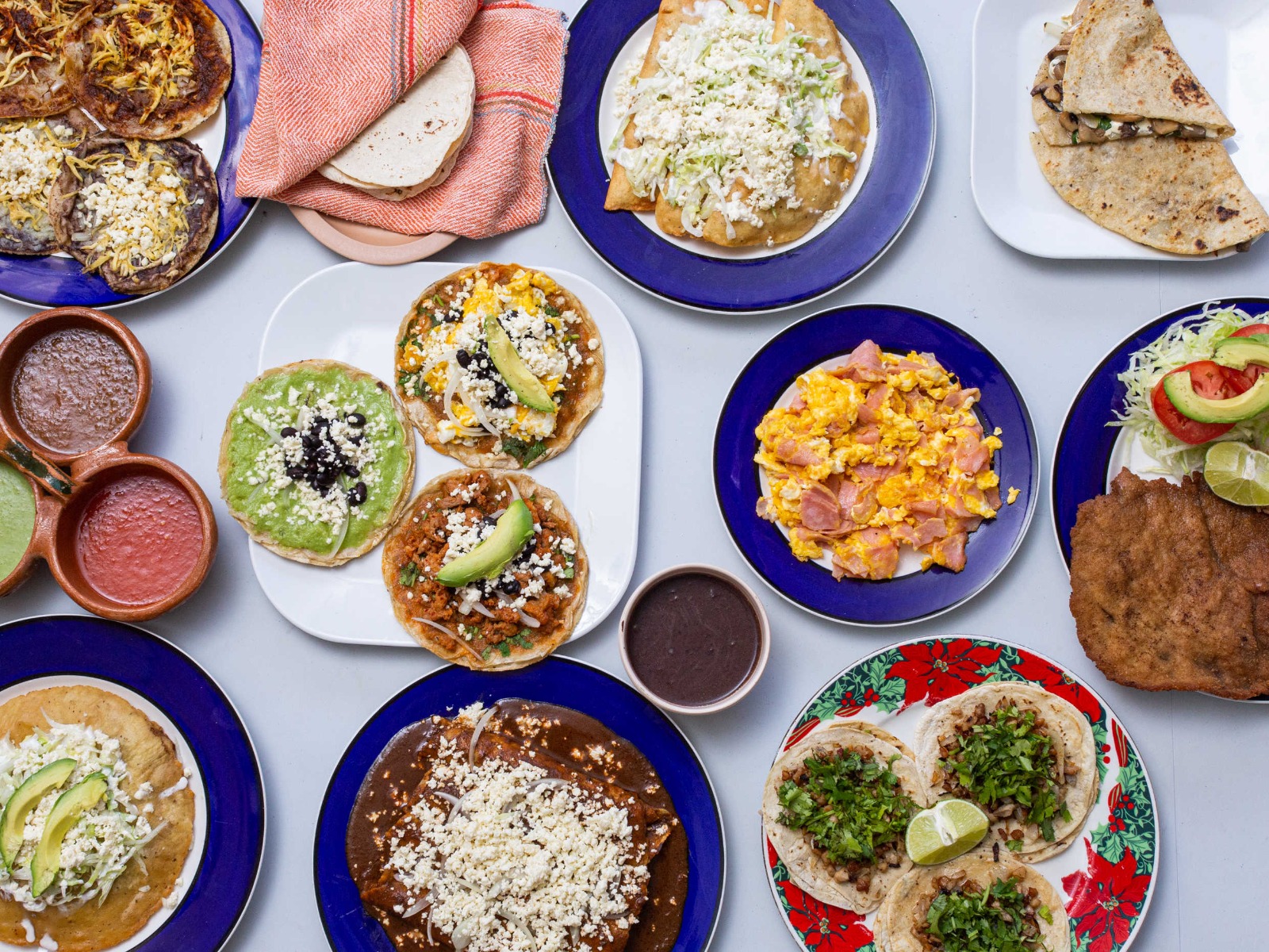 Tortilla de mano, frijol, papa, cebolla y carne deshebrada.