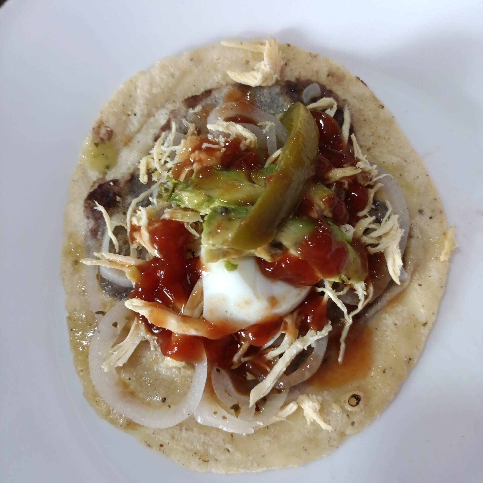 Esquisito panucho tortilla con frijol adentro cebolla encurtida preparada con pollo huevo aguacate chile encurtido y catsup