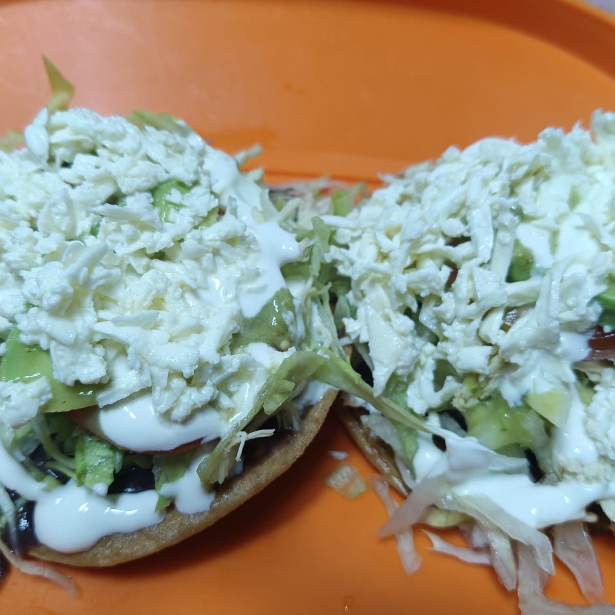 Tostadas lleva frijol lechuga pollo guisado,blanco o picadillo crema queso tomate aguacate y salsa al gusto (salsas ranchera, tomate chipotle, verde y mole