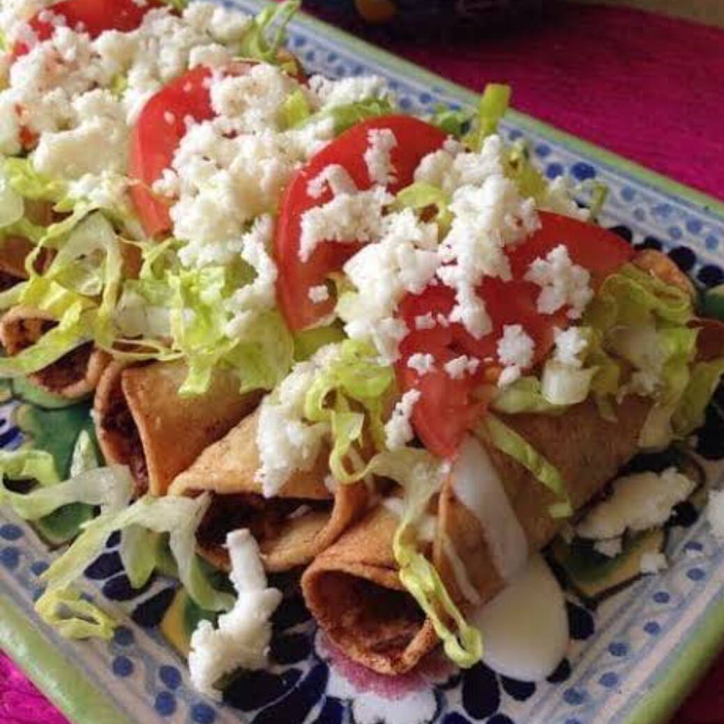 Tacos dorados de papa con chorizo,lechuga, crema, queso, salsa (tomate, verde, ranchera o) orden de 5 .