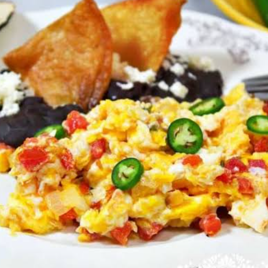 Huevos revueltos con tomate, chile y cebolla acompañado de frijoles refritos y tortillas