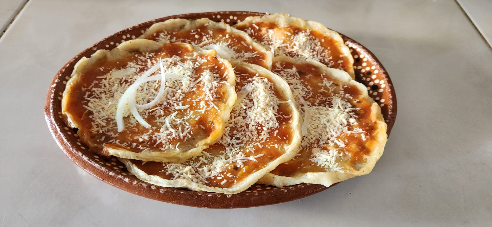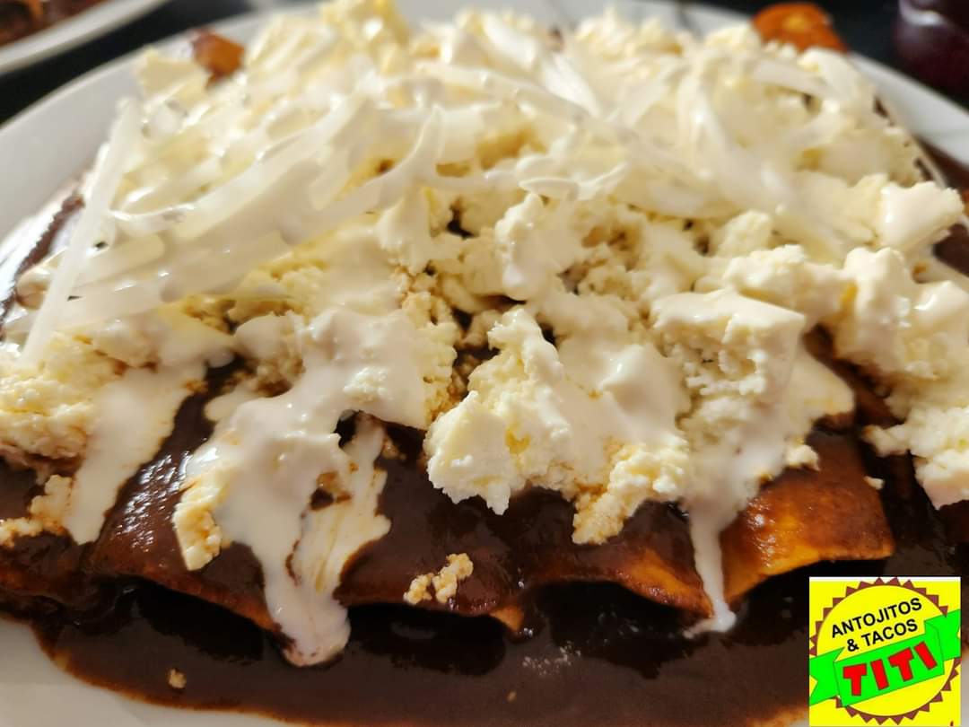 Enmoladas con tortillas recién echas a mano con mole de la casa acompañadas de queso , crema y cebolla