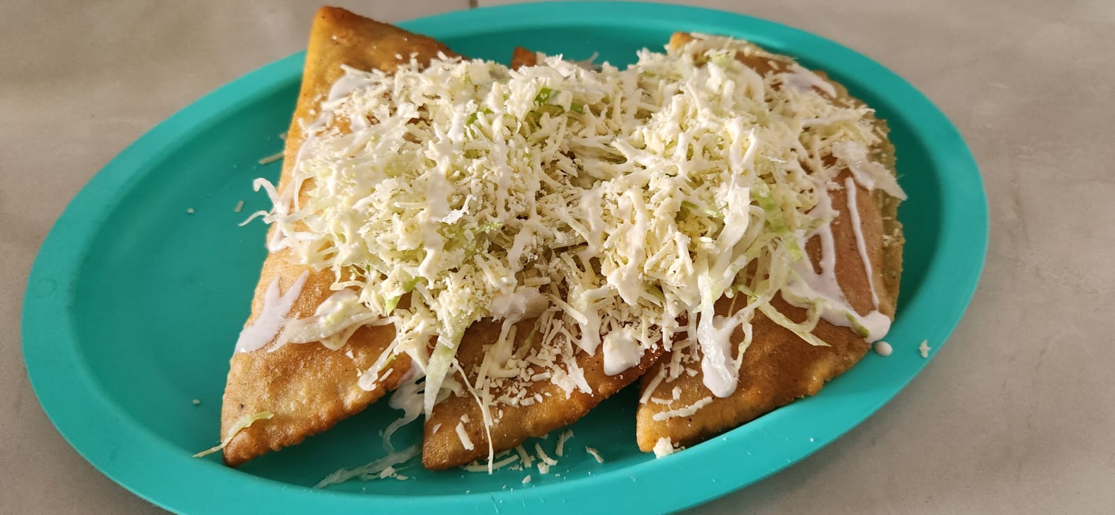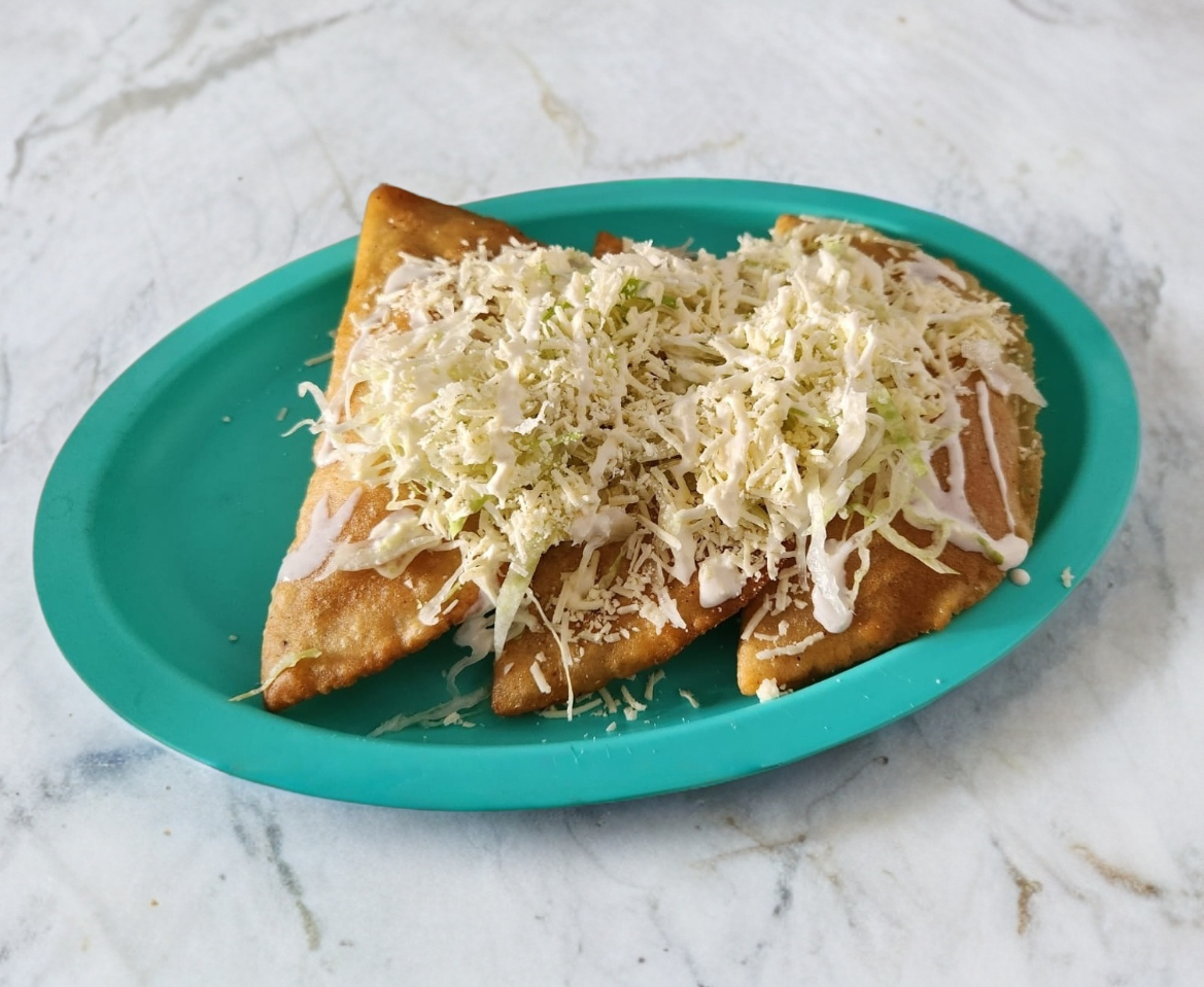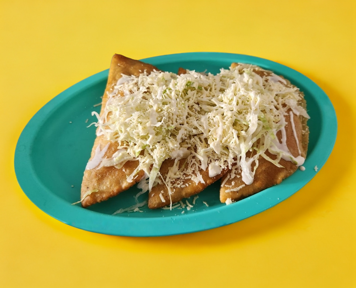 Tortilla de maíz rellena de proteína a elegir frita y acompañada con lechuga, queso y crema.