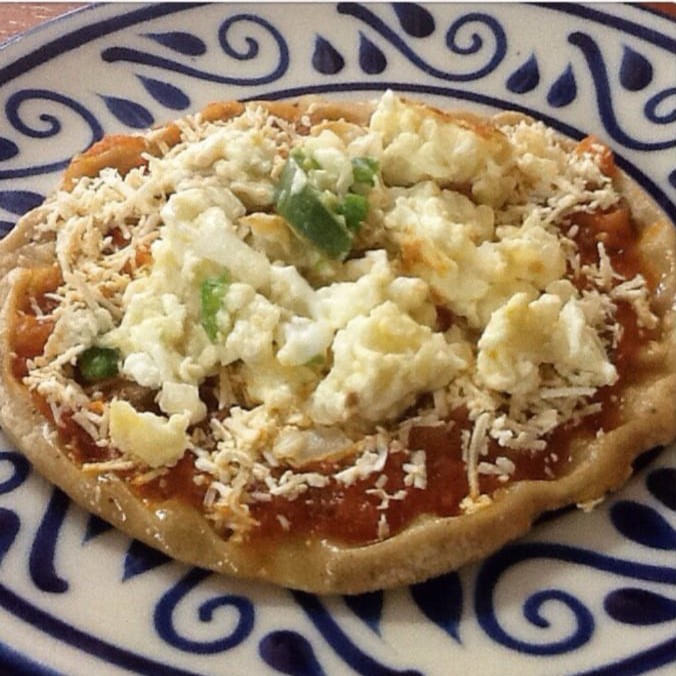 1 Tortilla de maíz tostada acompañada con frijoles, lechuga, pollo o picadillo , queso y crema