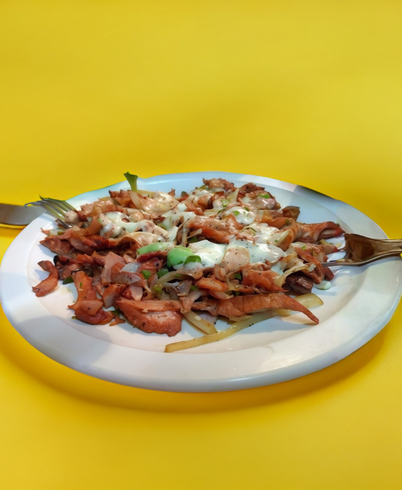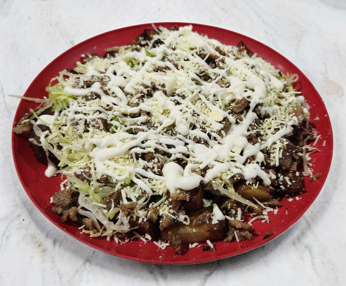 Papá guisada y frita acompañada de proteína a elegir, queso y crema