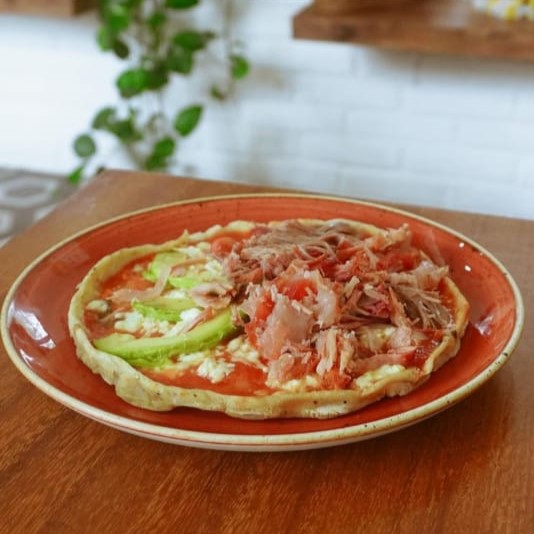 Tortilla de maíz , salsa a elegir , proteína a elegir, queso y cebolla