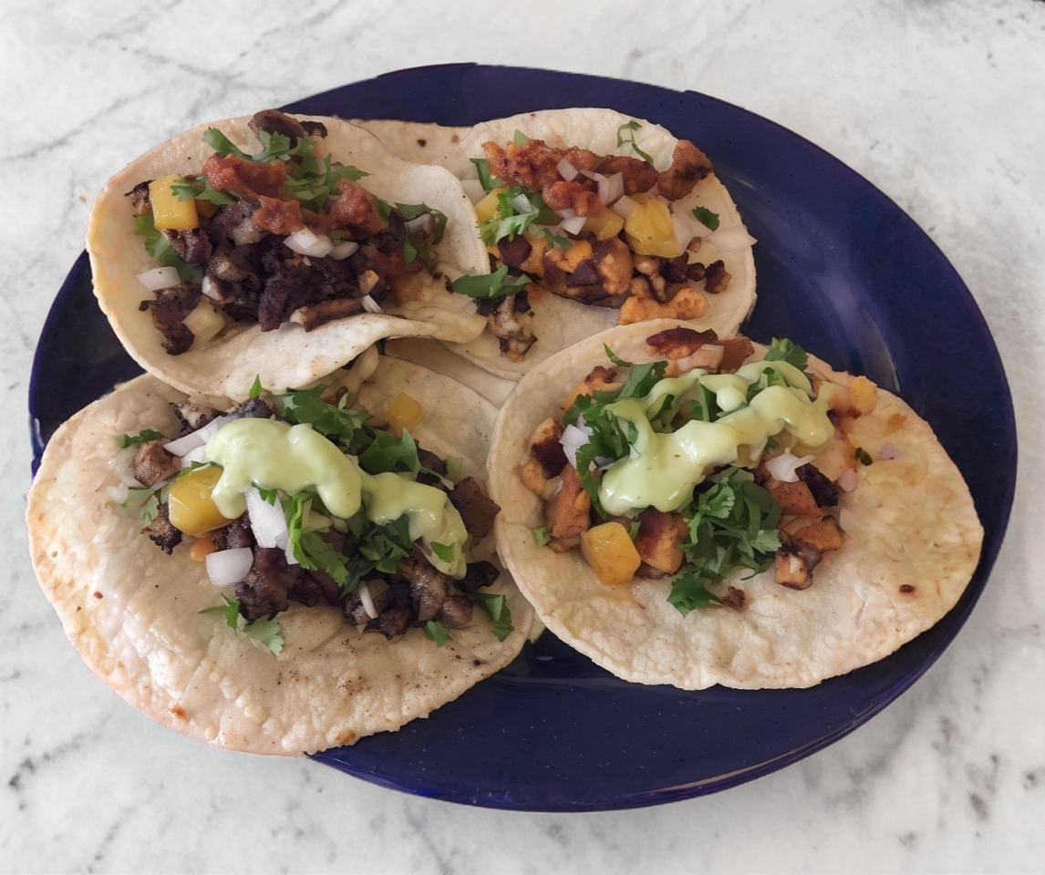 Una combinación de, pastor, piña y queso acompañado con tortillas de maíz verduras