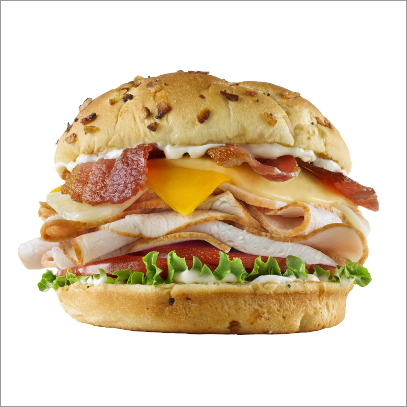 Pan de cebolla, pechuga de pavo 85 g calientita acompañada con queso gouda, manchego y cheddar, tocino, lechuga, jitomate y mayonesa.