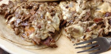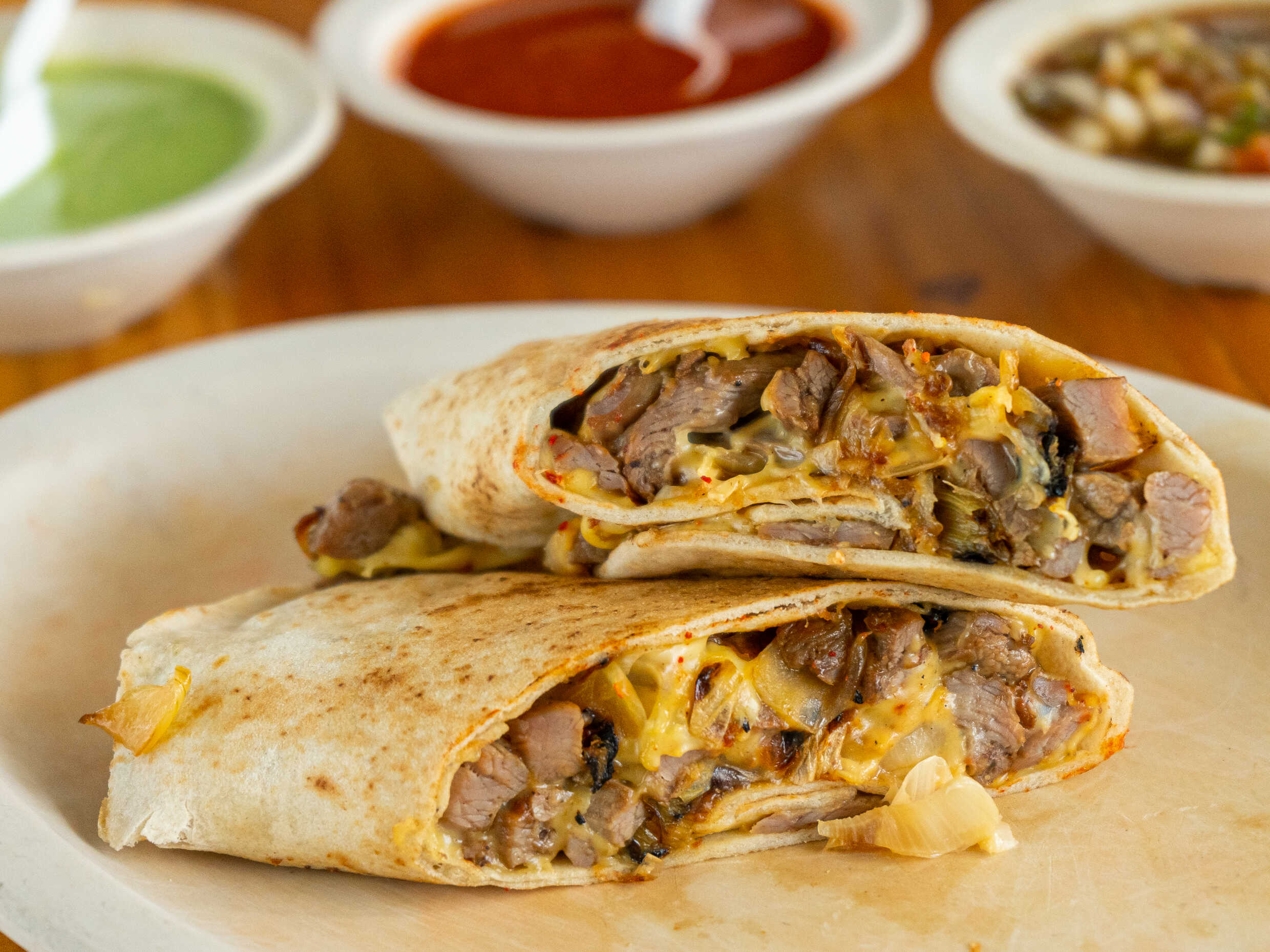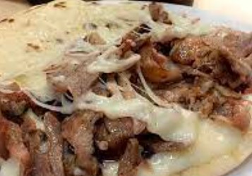 250 g de pastor con queso, cebolla, cilantro y piña al gusto.