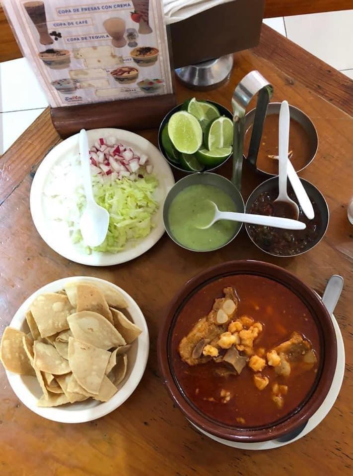 Incluye totopos, rábano, lechuga, cebolla, limón y salsa verde.