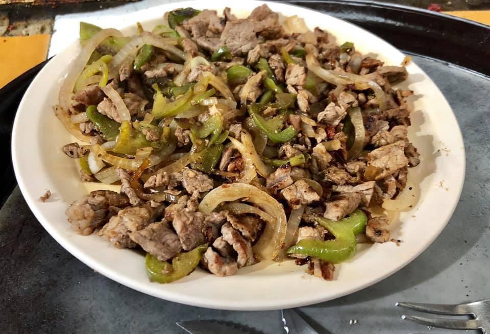 Tocino, pastor, bistec, morrón, queso, tomate y cebolla.