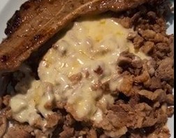 Chuleta, chorizo, champiñón, cebolla morrón y queso.