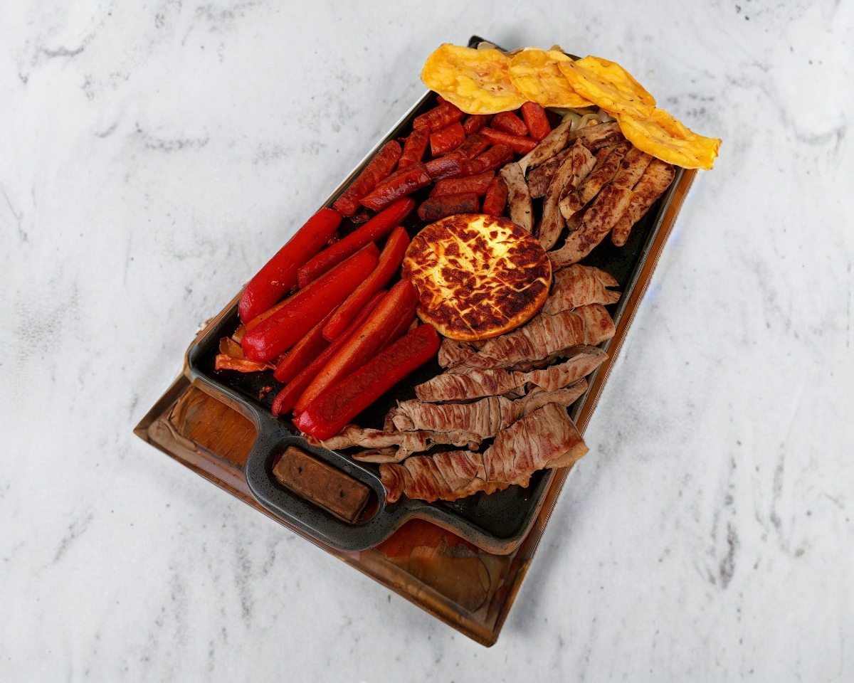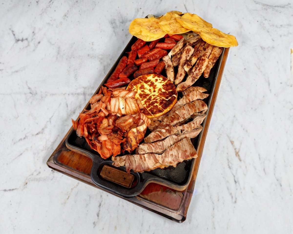 Platillo conformado por 2 proteínas de 125gr c/u, Arrachera ANGUS-Sirloin-Chistorra-Pastor, incluyendo 1 orden de guacamole tradicional, 1 orden queso parrillero, 2 doraditas c/queso, salsas, limones y verduras, asado de cebollita con nopales. (2-3 personas)