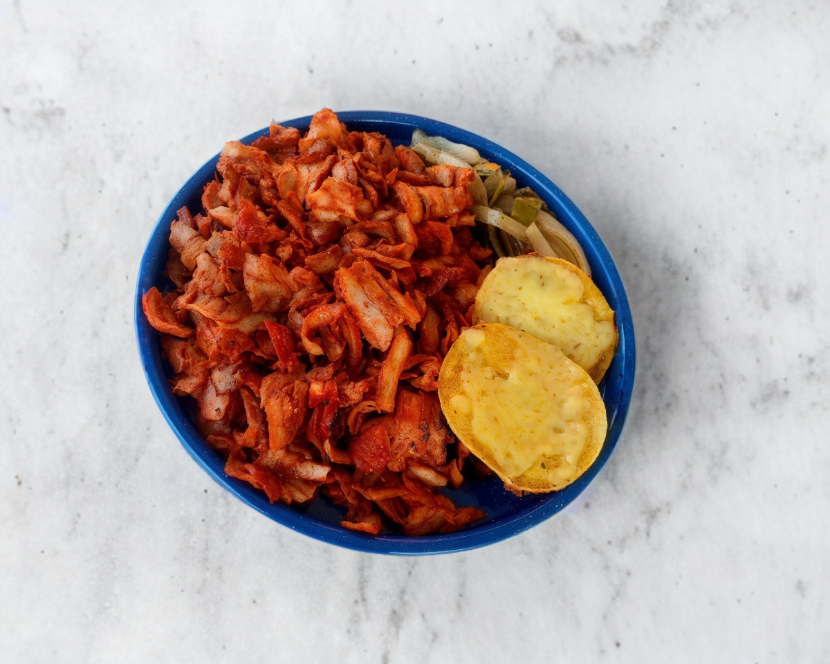 Deliciosa carne al pastor, incluyendo 15 tortillas, rodaja de queso asadero, como acompañamiento, salsa verde, verduras, limones y cebolla con nopales (1 persona)