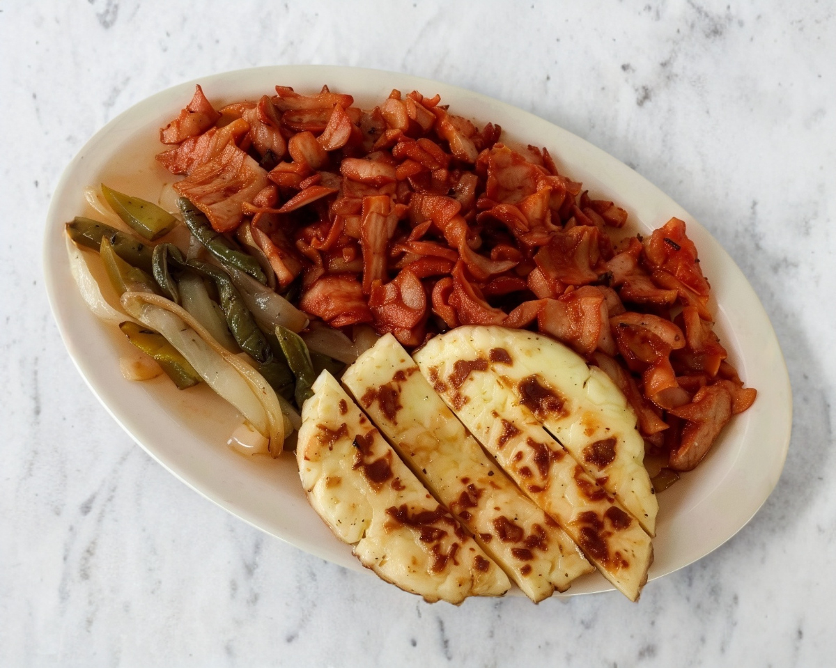 Combinacion de carne al pastor, chuleta, salchicha asadera, con chile morron, cebolla asada y fundido de queso manchego